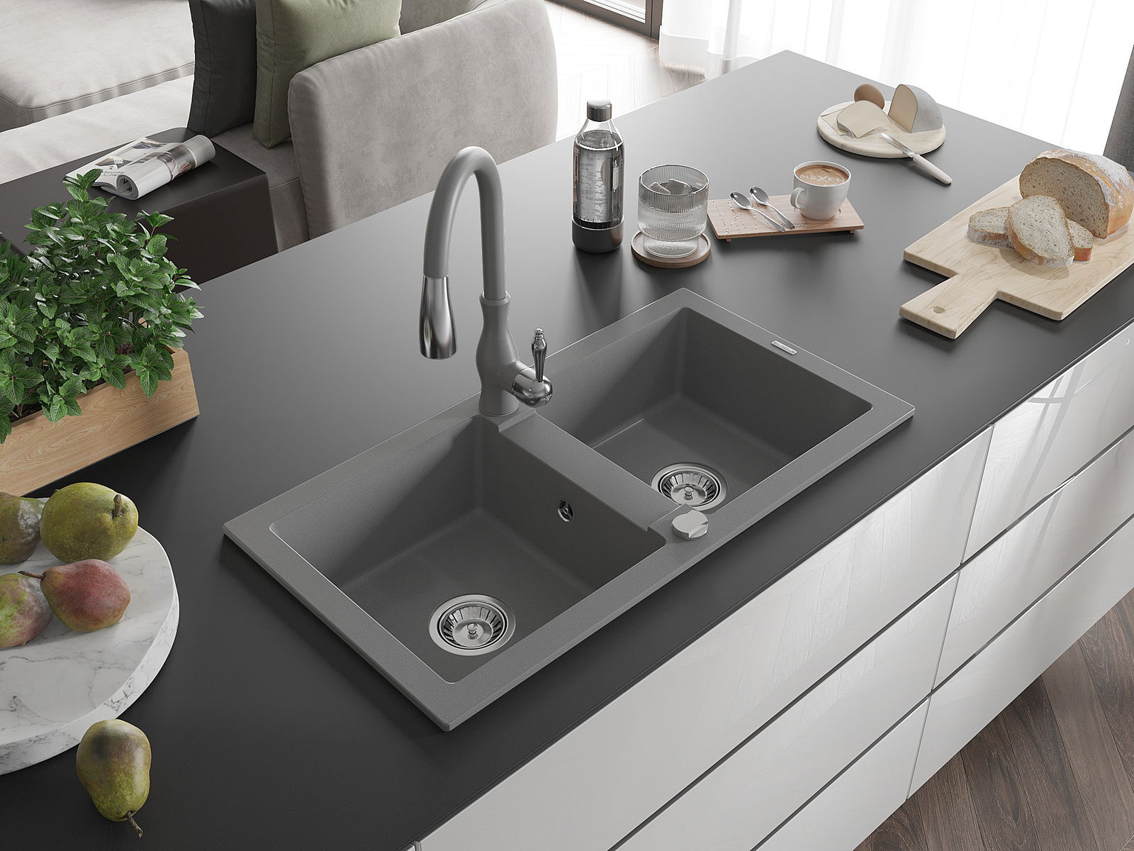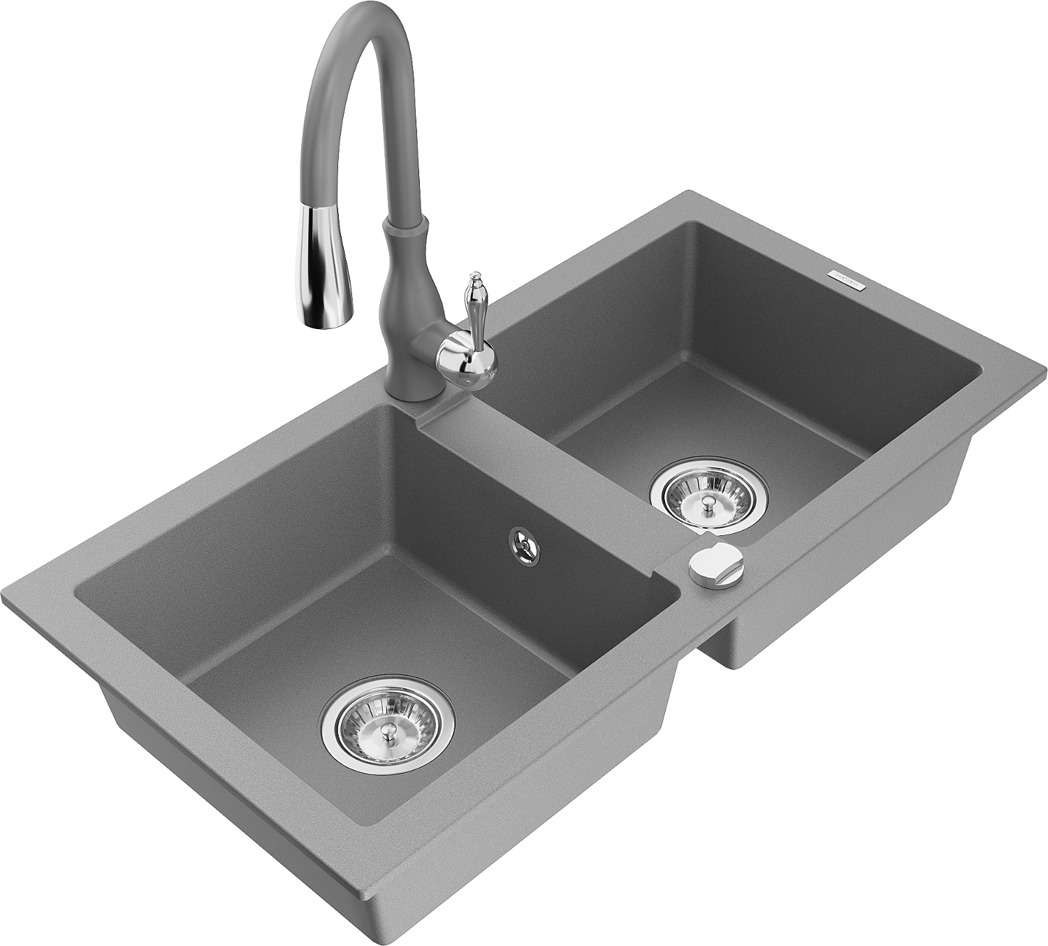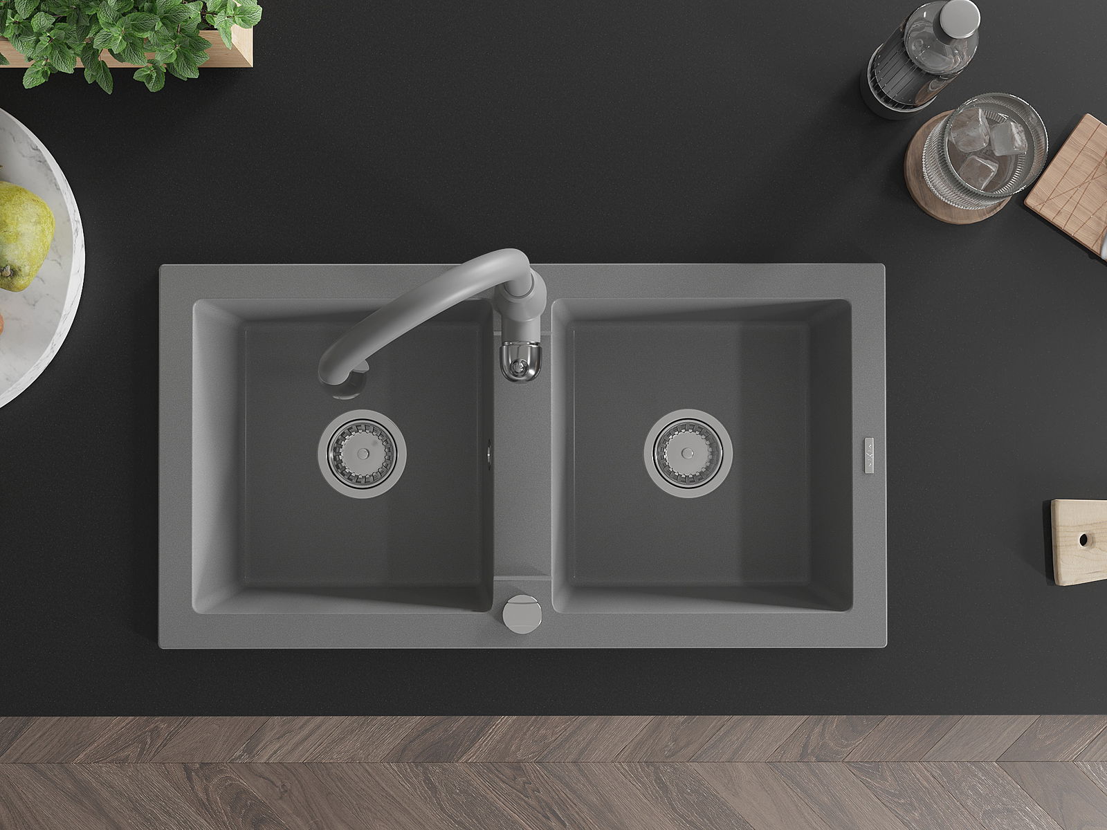 Mexen Mario granito plautuvė dviejų kamerų su virtuviniu maišytuvu Savita, pilka - 6504-71-672601-71