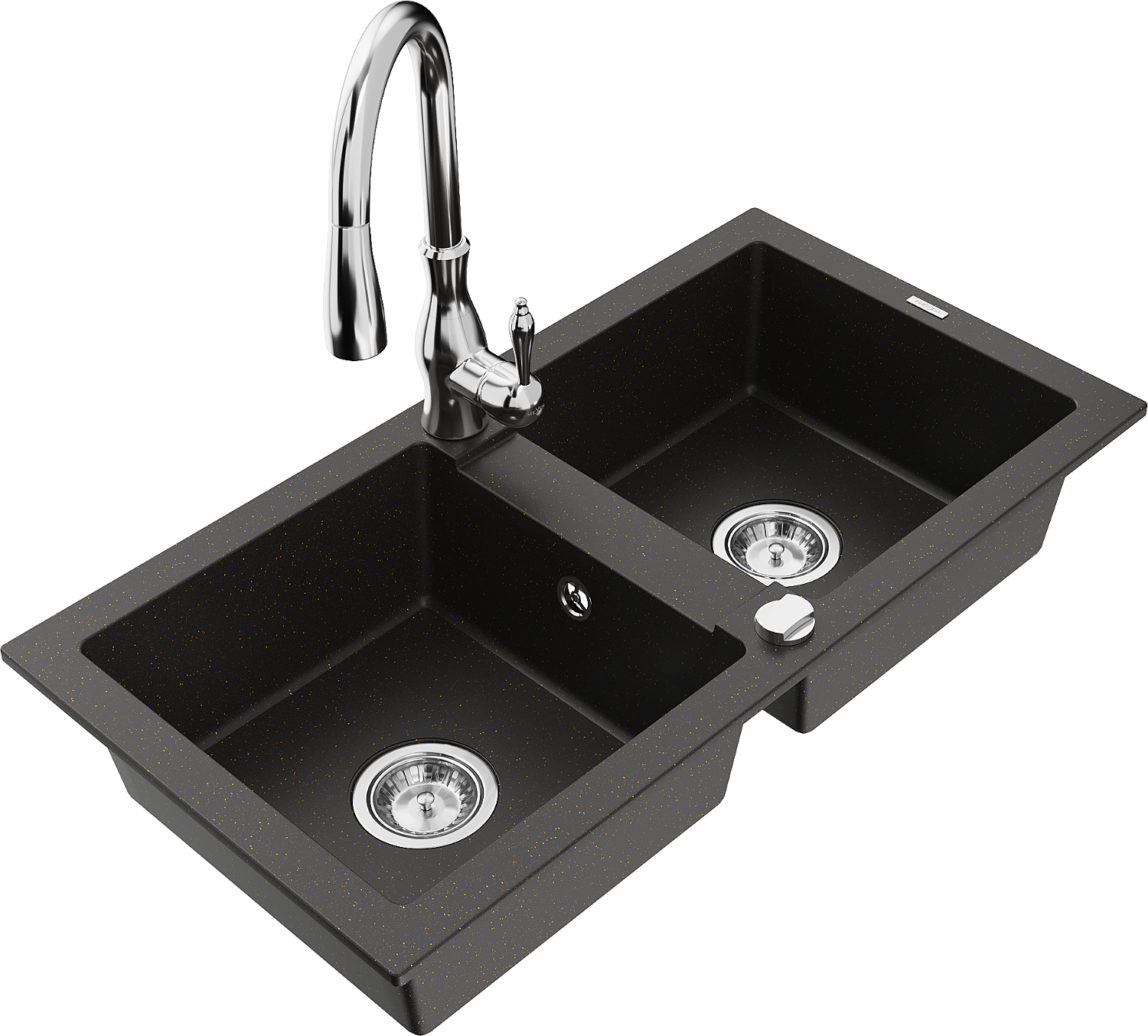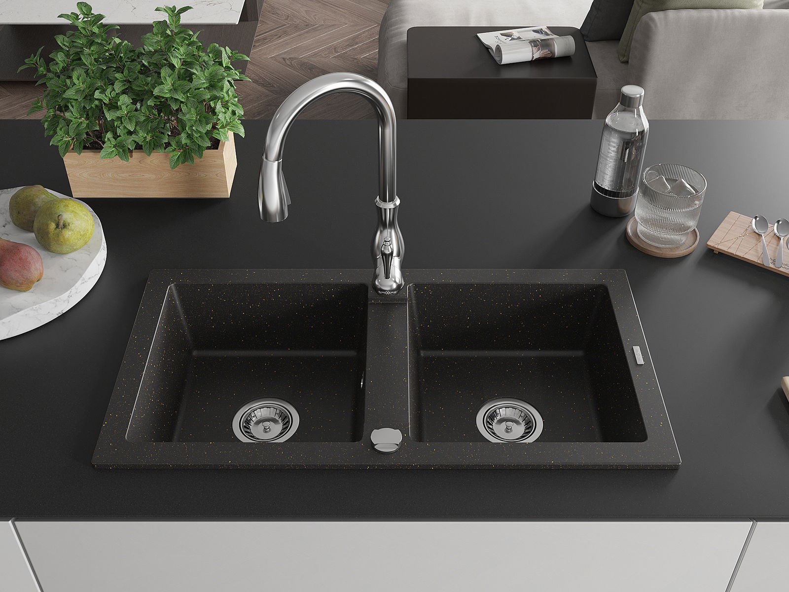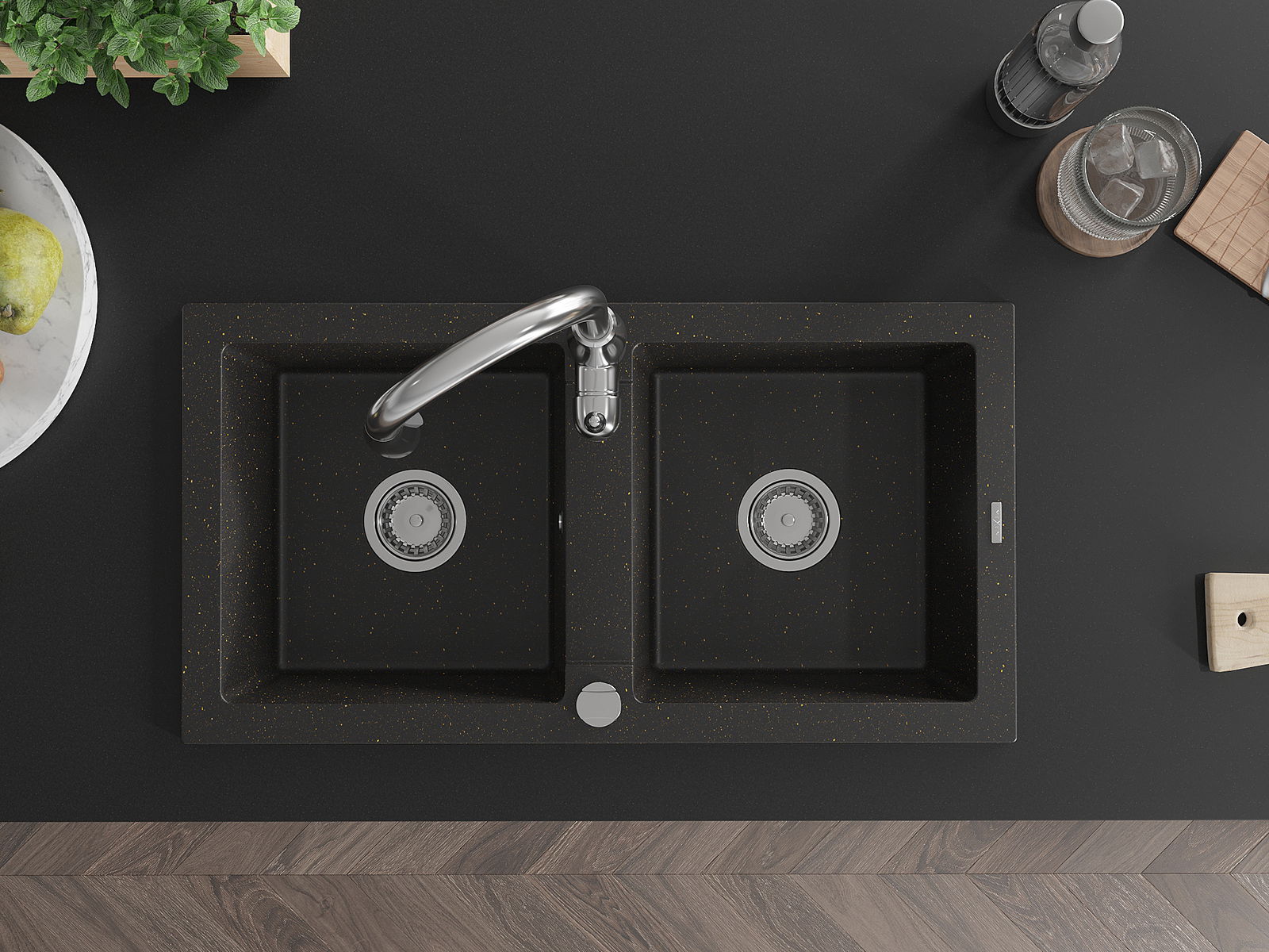 Mexen Mario dviejų skylių granitinė plautuvė su virtuvės maišytuvu Savita, juodas/auksinis metalikas - 6504-75-672601-00