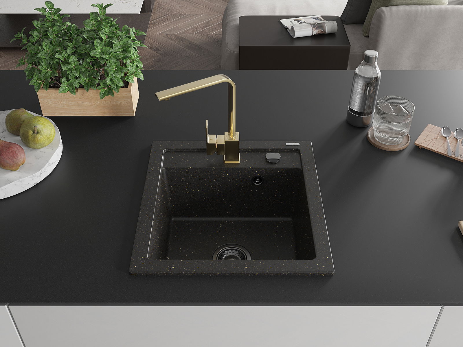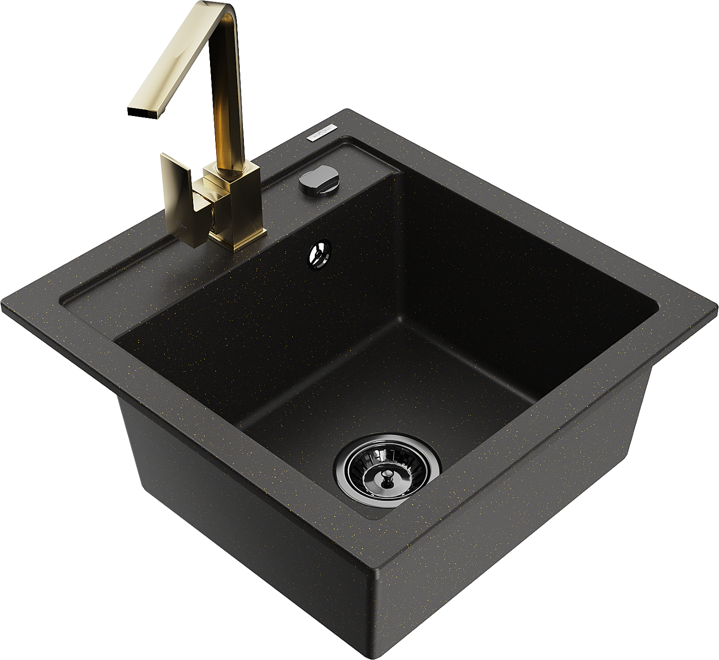 Mexen Vito granito plautuvė, 1 skyrius, su virtuvės čiaupu Rita, juoda/auksinė metalika - 6503-75-670300-50-B