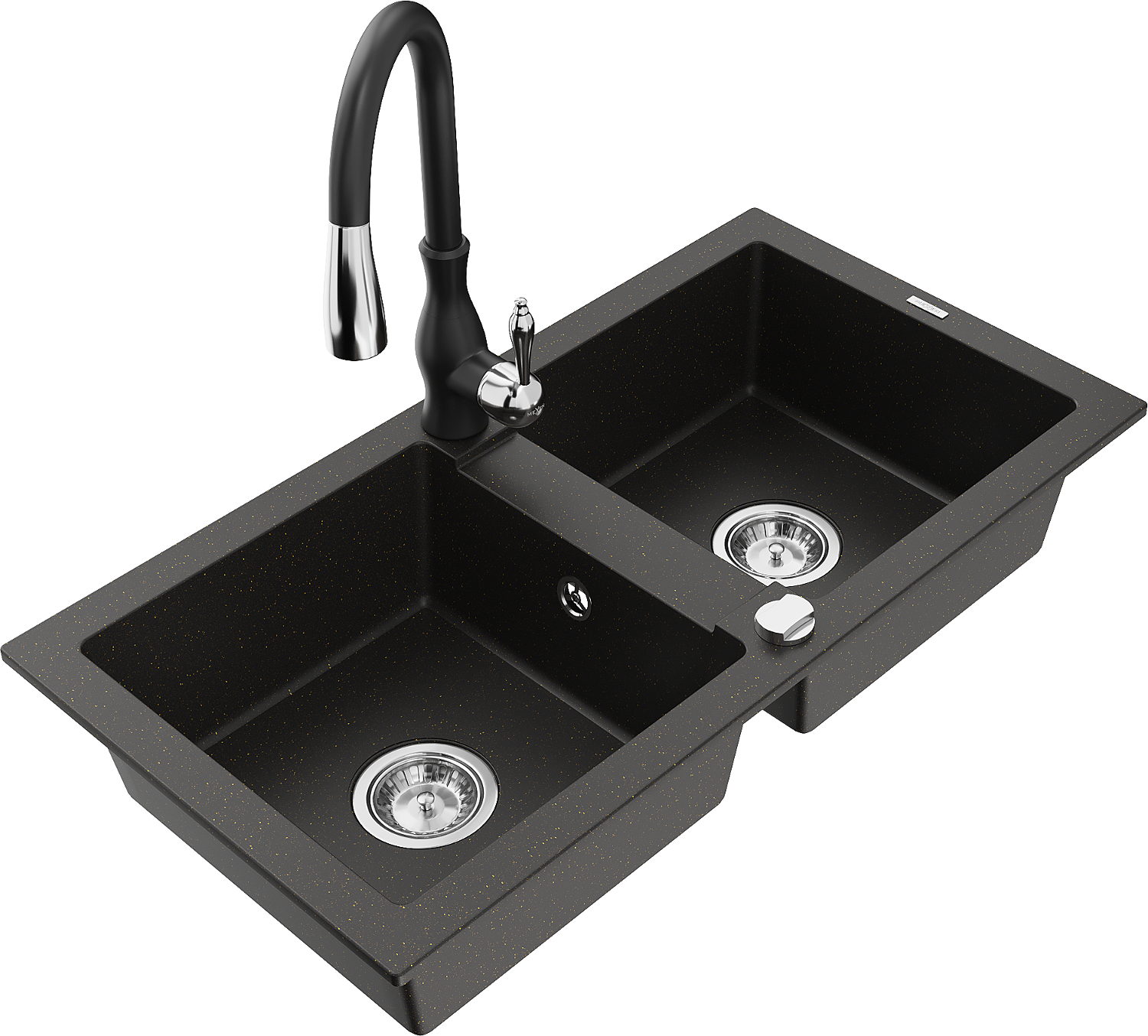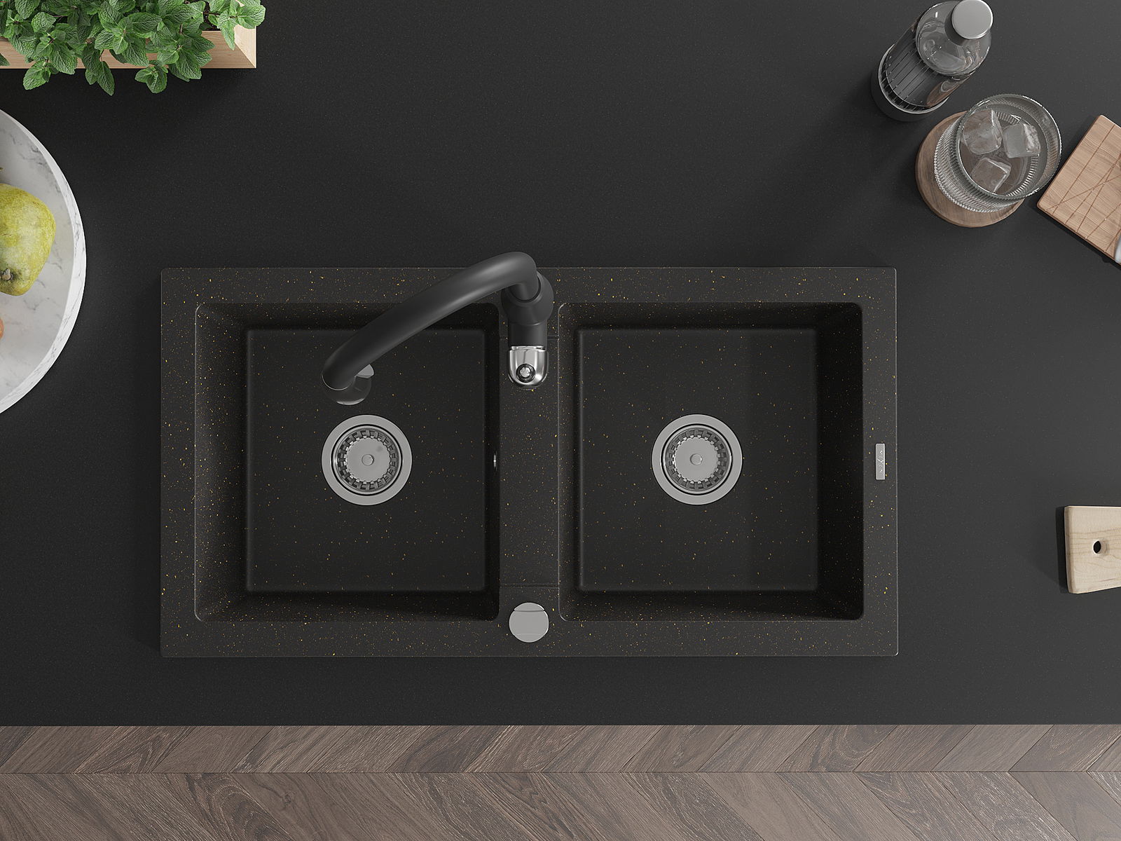 Mexen Mario granitinė 2 skyrių kriauklė su virtuviniu maišytuvu Savita, juoda/auksinė metalika - 6504-75-672601-70