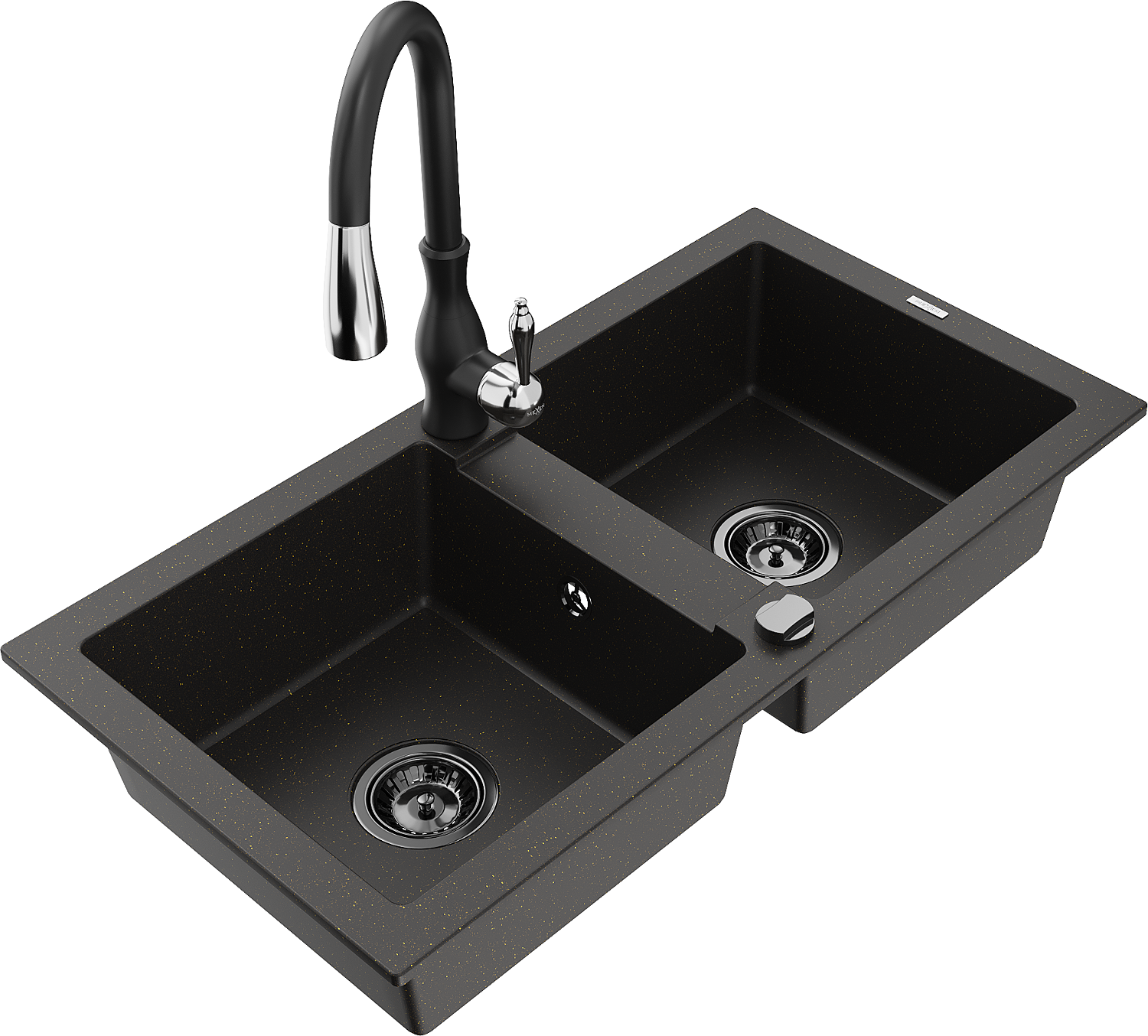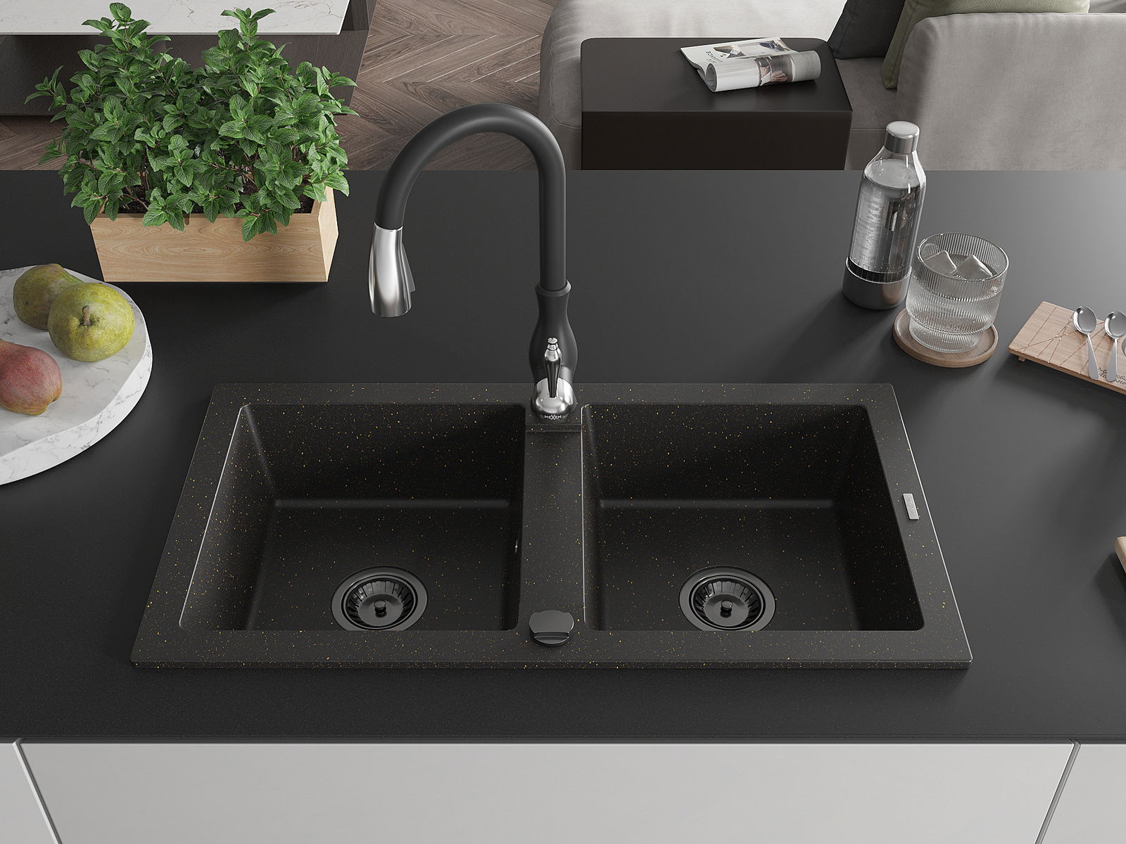 Mexen Mario 2 kamerų granitinė kriauklė su virtuviniu maišytuvu Savita, juoda/auksinė metalika - 6504-75-672601-70-B