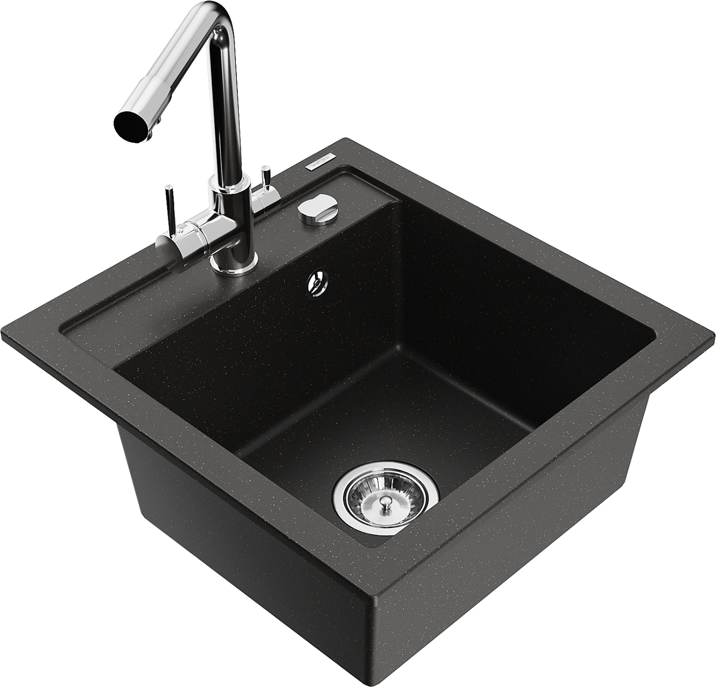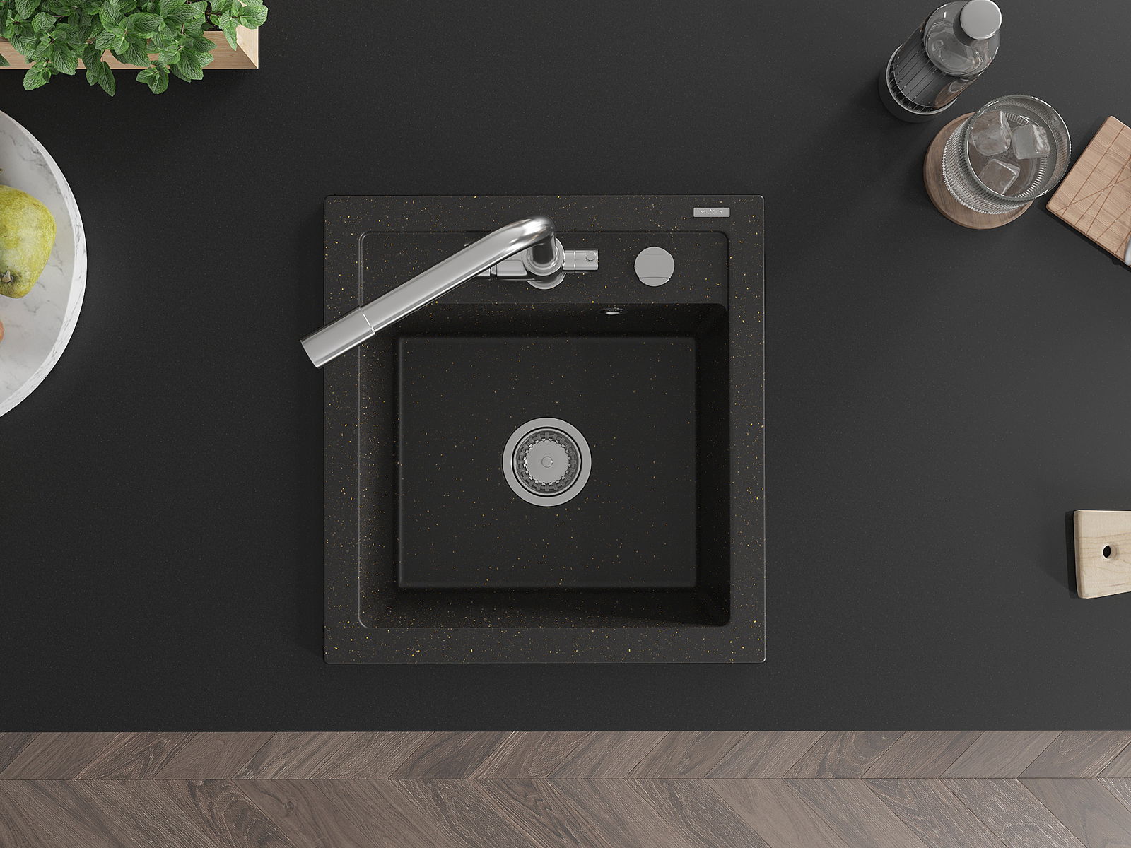 Mexen Vito granitinė vienaaukštė kriauklė su virtuviniu maišytuvu Duero, juoda/auksinis metalikas - 6503-75-671600-00