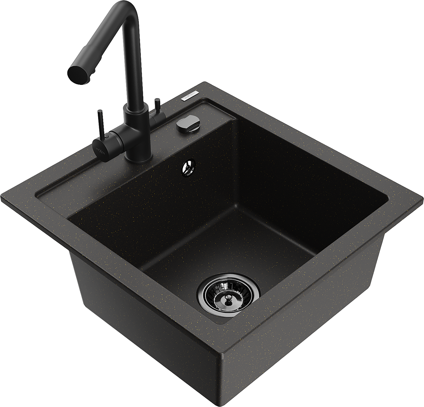 Mexen Vito granitinė vienos dalies plautuvė su virtuviniu maišytuvu Duero, juoda/aukso metalo spalva - 6503-75-671600-70-B