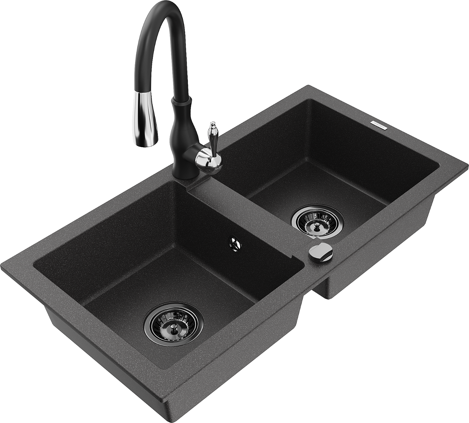 Mexen Mario dviejų skylių granito kriauklė su virtuviniu maišytuvu Savita, juoda taškuota - 6504-76-672601-70-B