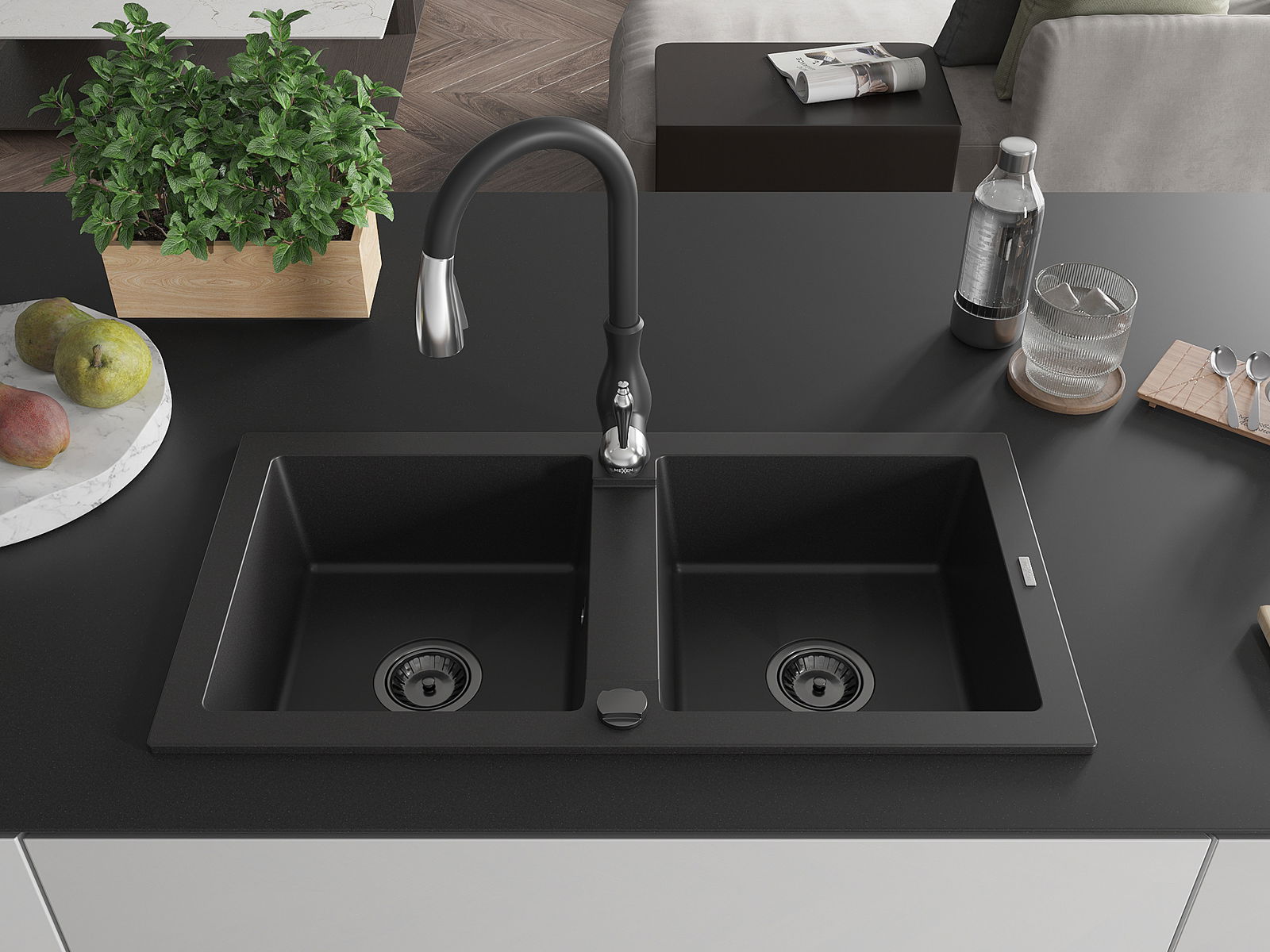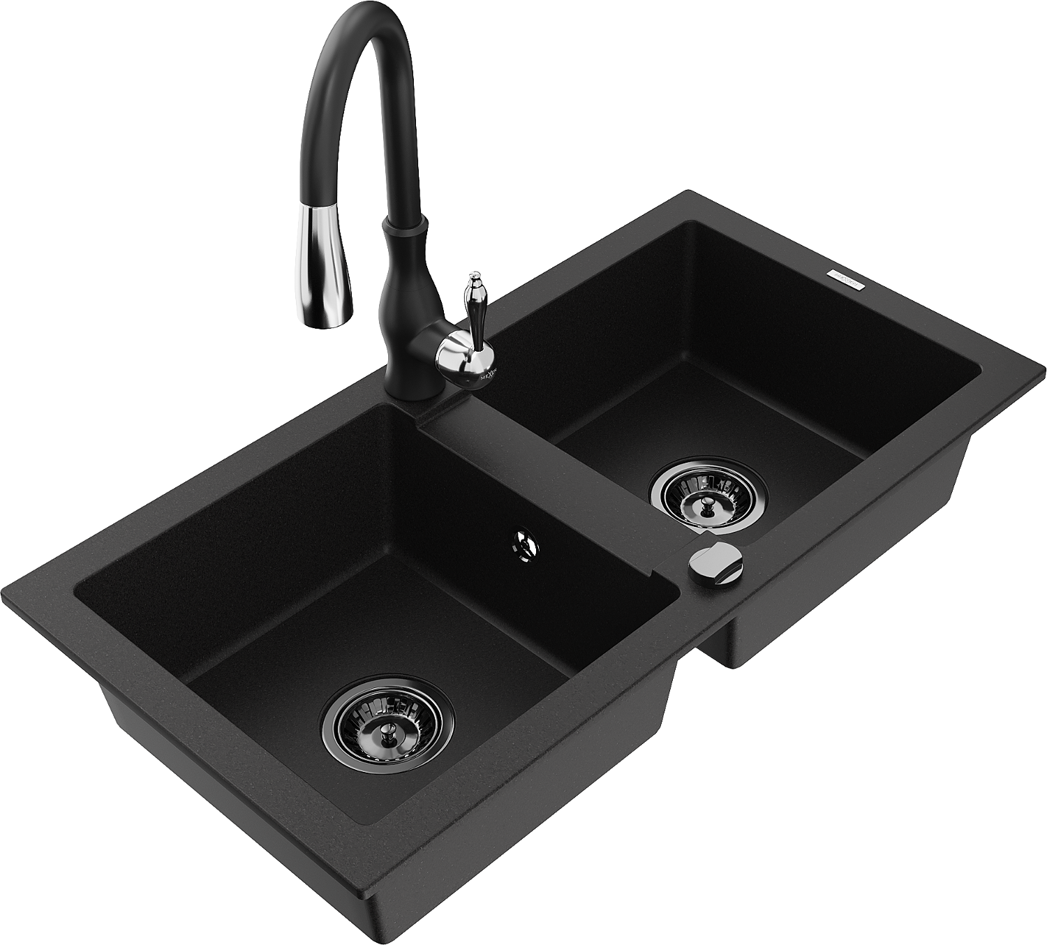 Mexen Mario granitinė dviejų skyrių plautuvė su virtuviniu maišytuvu Savita, juodos spalvos - 6504-77-672601-70-B