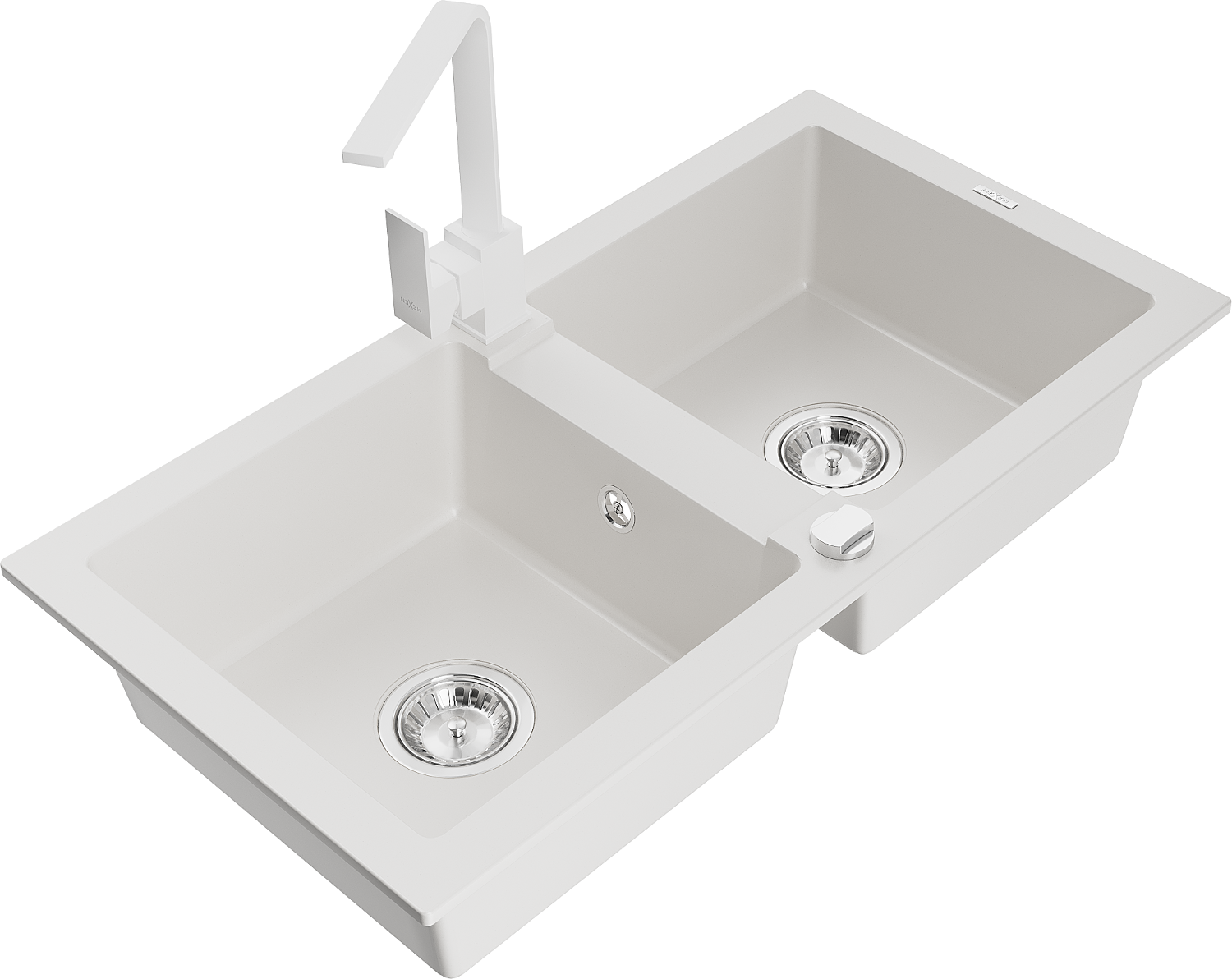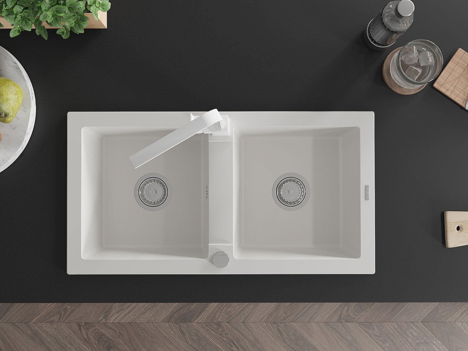 Mexen Mario dviejų skyrių granito plautuvė su Rita virtuviniu maišytuvu, balta - 6504-20-670300-20