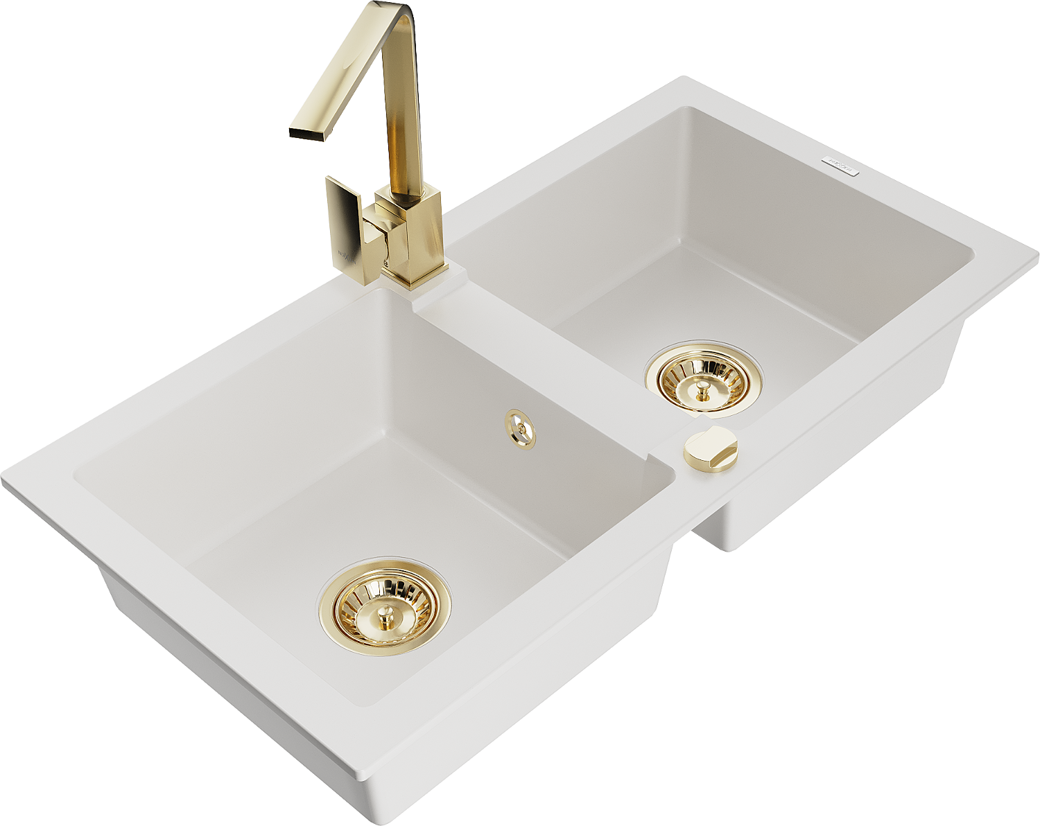 Mexen Mario granitinė dviejų skyrių plautuvė su virtuviniu maišytuvu Rita, balta - 6504-20-670300-50