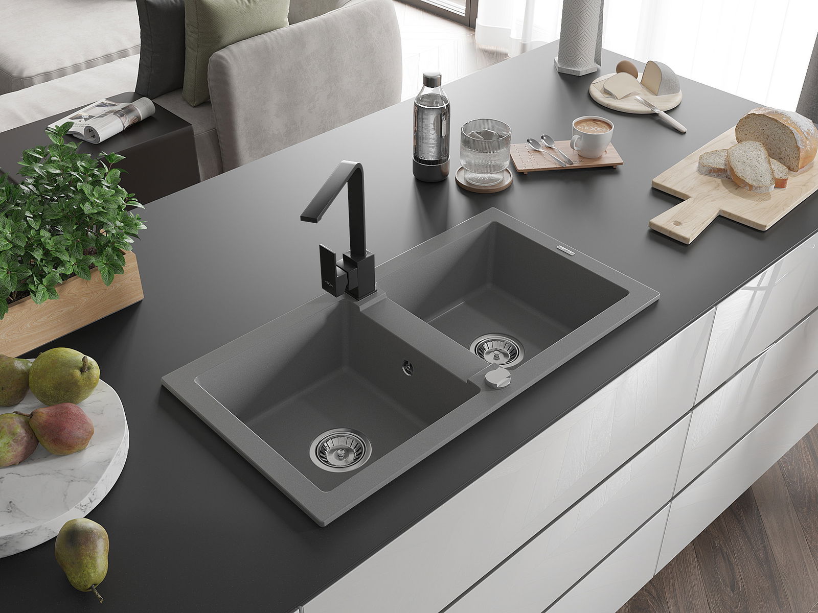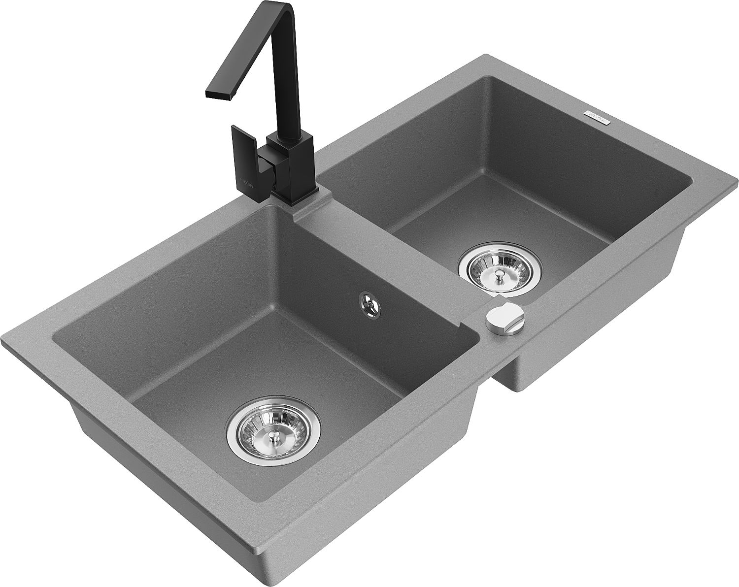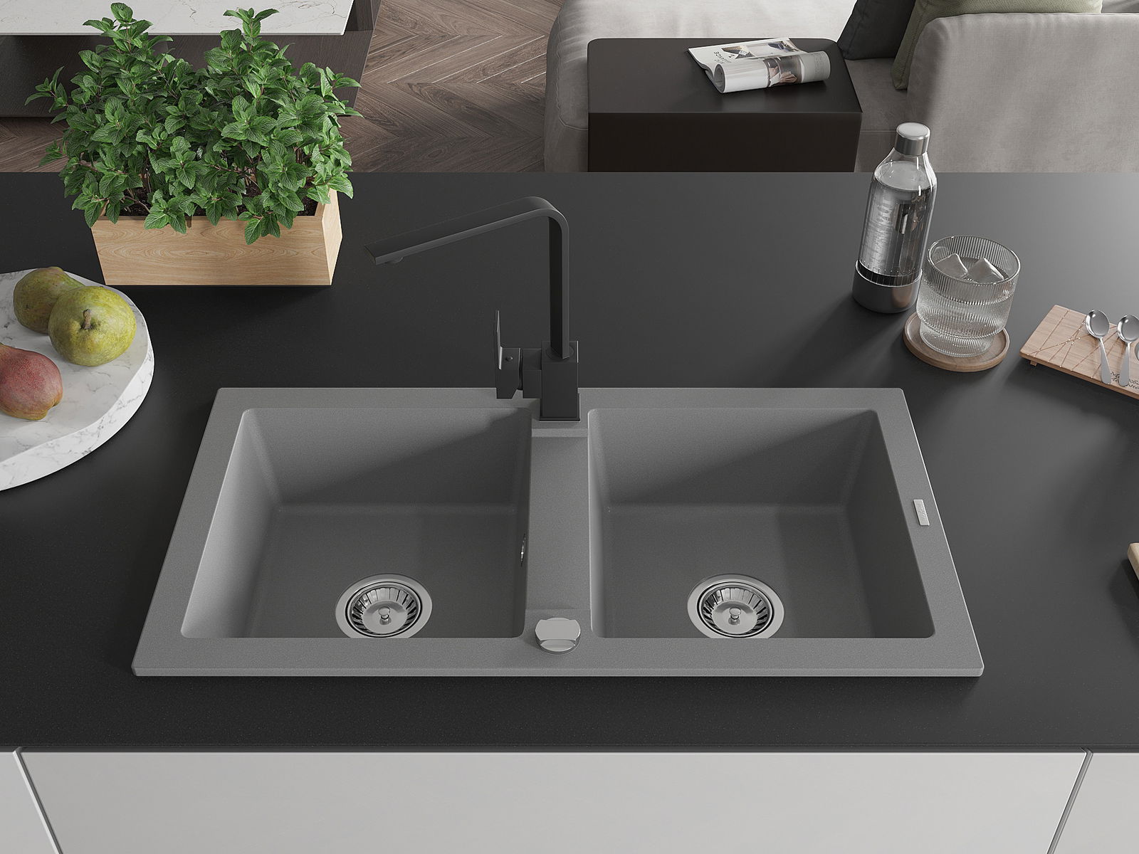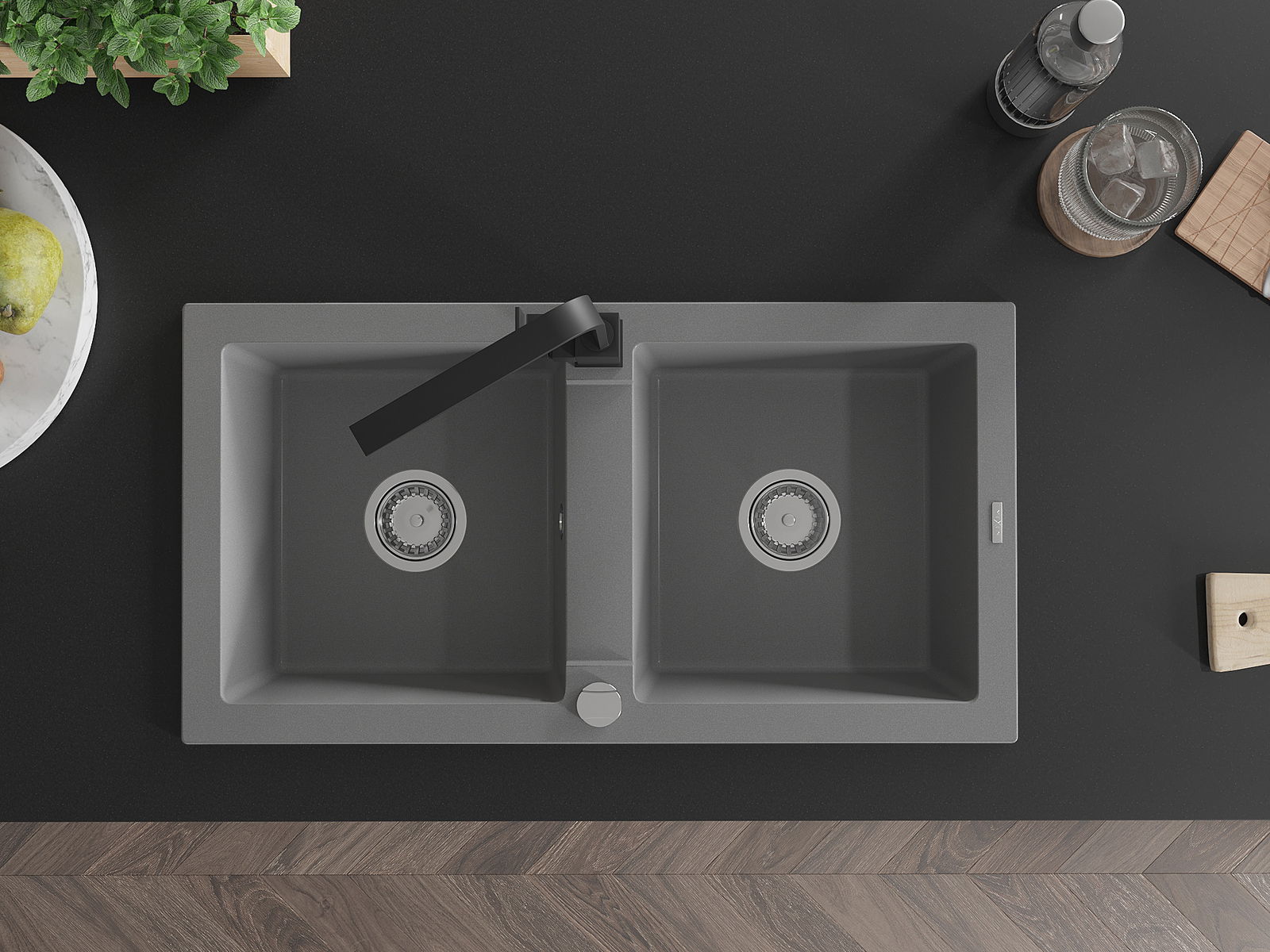 Mexen Mario dviejų skyrių granito plautuvė su Rita virtuviniu maišytuvu, pilka - 6504-71-670300-70