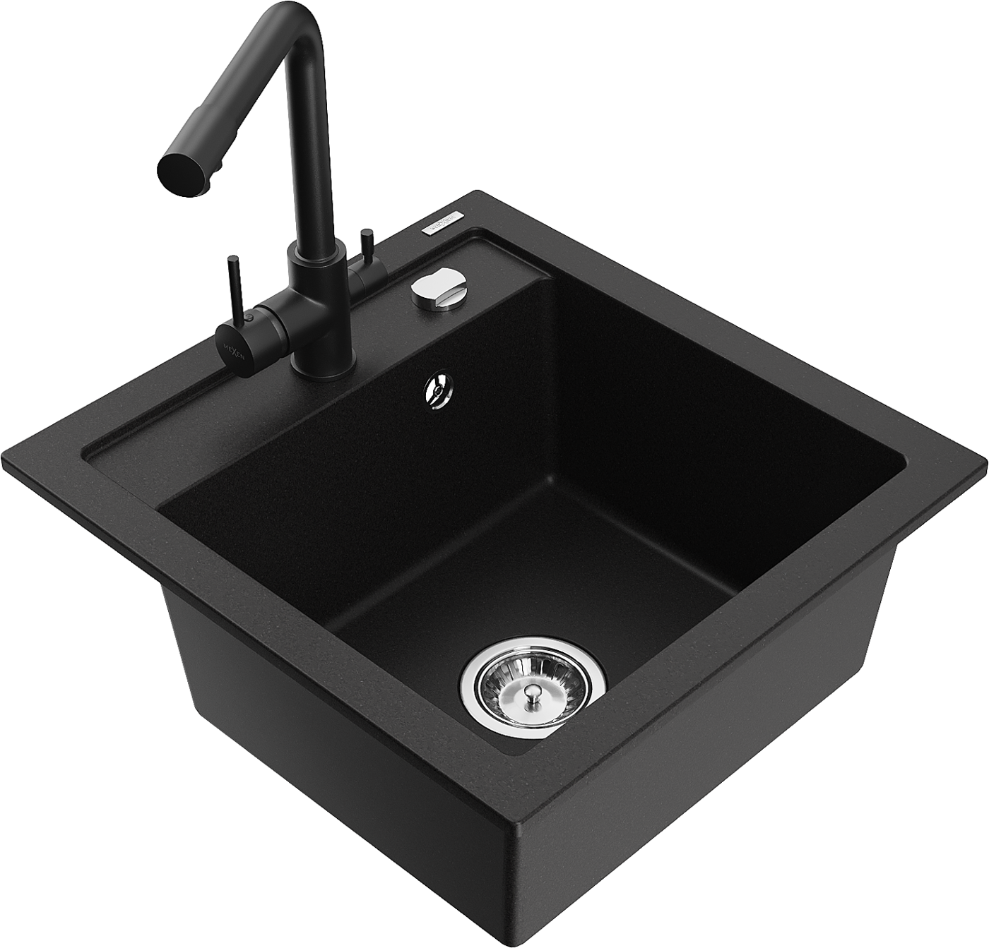 Mexen Vito granito virtuvės plautuvė su vienu skyriumi ir Duero virtuviniu maišytuvu, juoda - 6503-77-671600-70