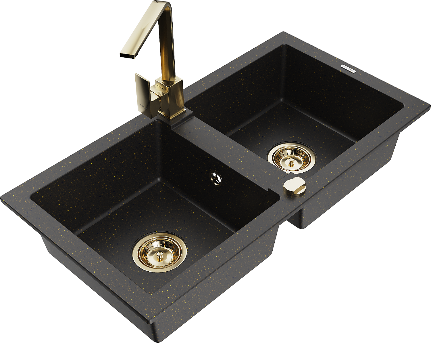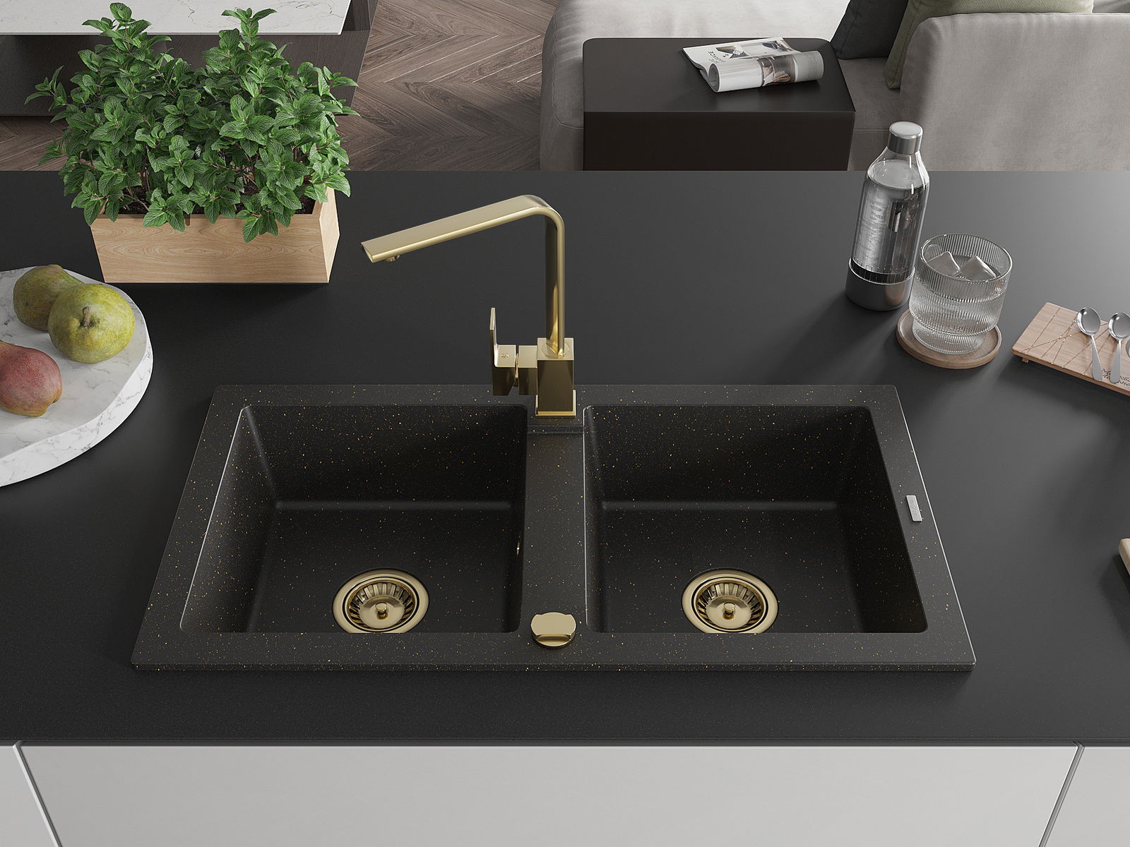 Mexen Mario granito kriauklė 2 skylių su Rita virtuvės maišytuvu, juodas/auksinis metalikas - 6504-75-670300-50