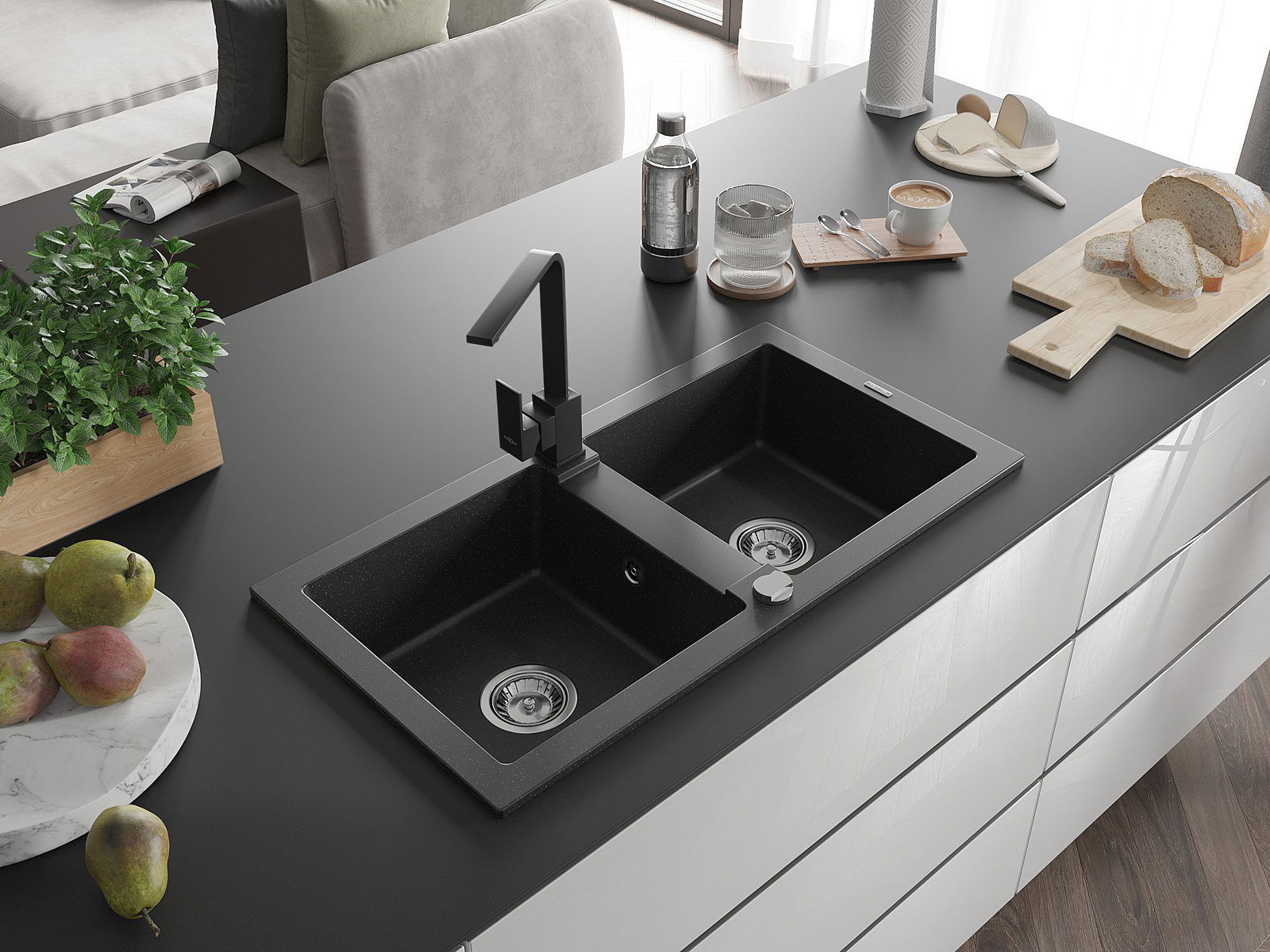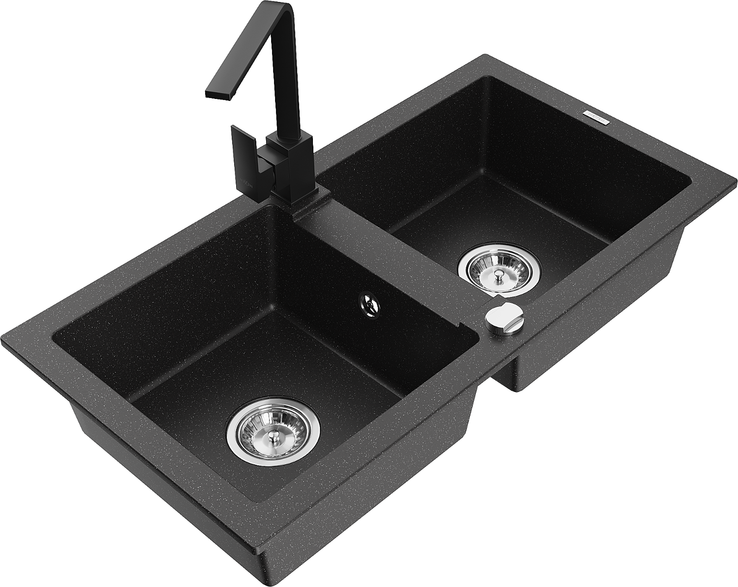 Mexen Mario granitinė dviejų skyrių plautuvė su virtuviniu maišytuvu Rita, juoda/auksinė metalinė - 6504-75-670300-70