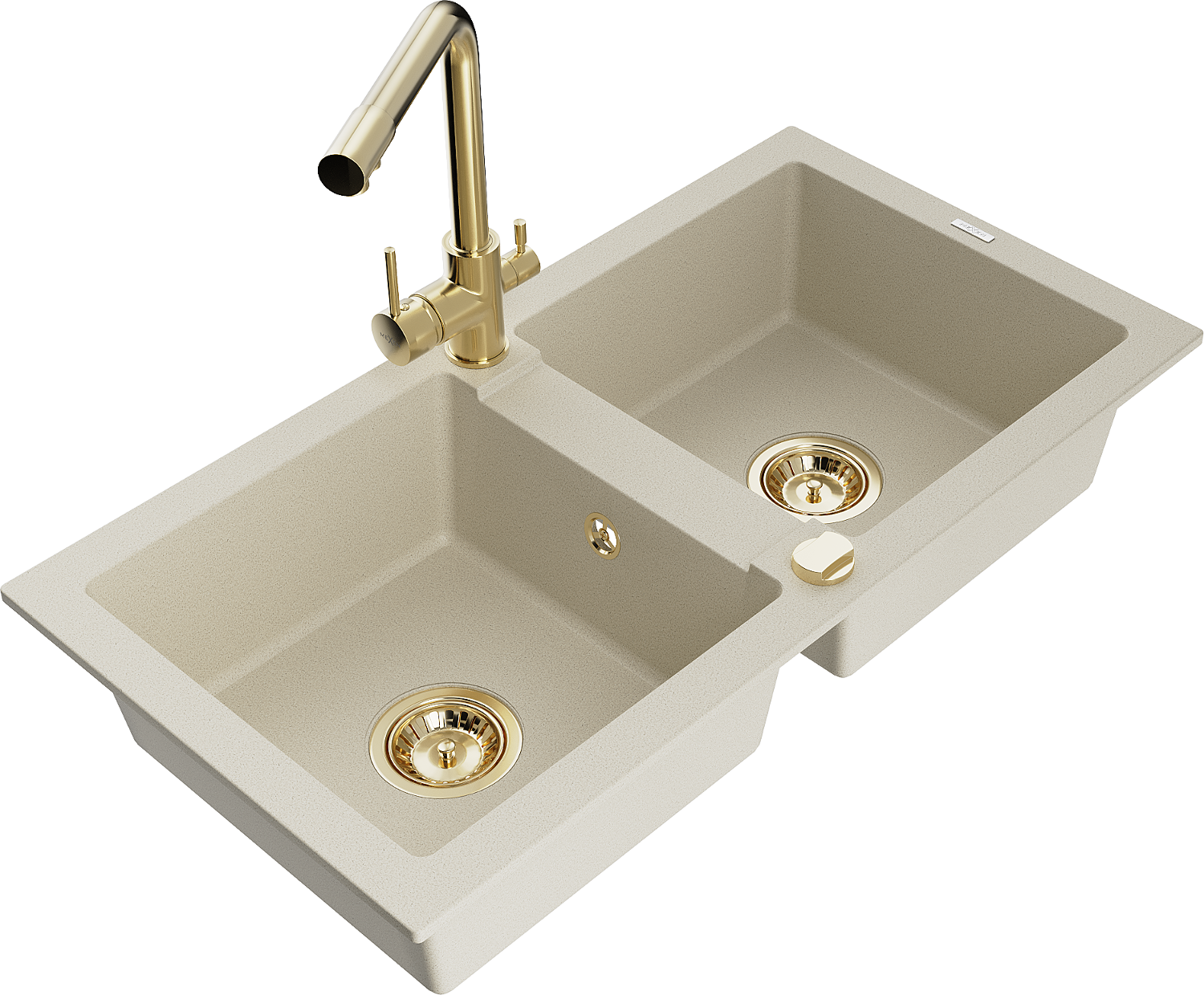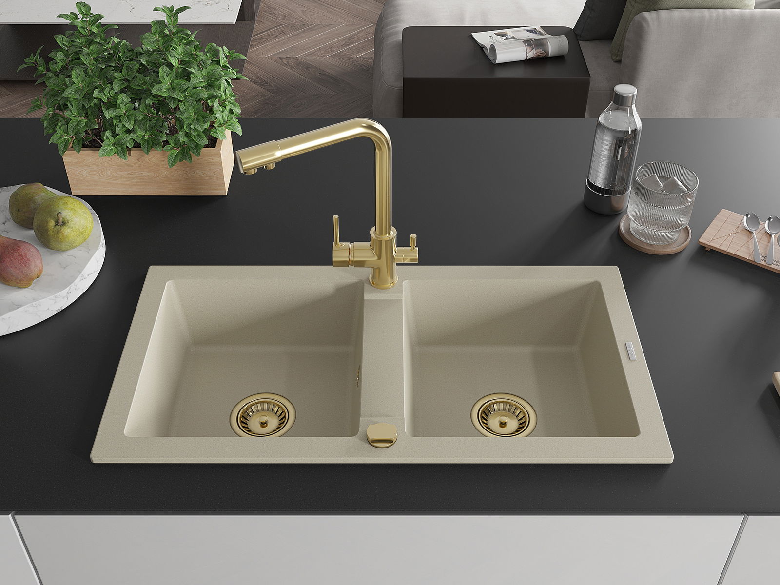 Mexen Mario dviejų kamerų granitinis kriauklė su Duero virtuviniu maišytuvu, smėlio spalva - 6504-69-671600-50