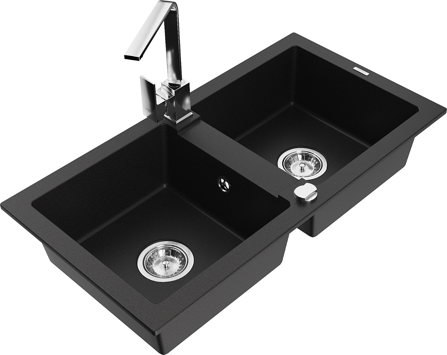 Mexen Mario granitinė dviejų kamerų virtuvinė plautuvė su virtuviniu maišytuvu Rita, juoda - 6504-77-670300-00