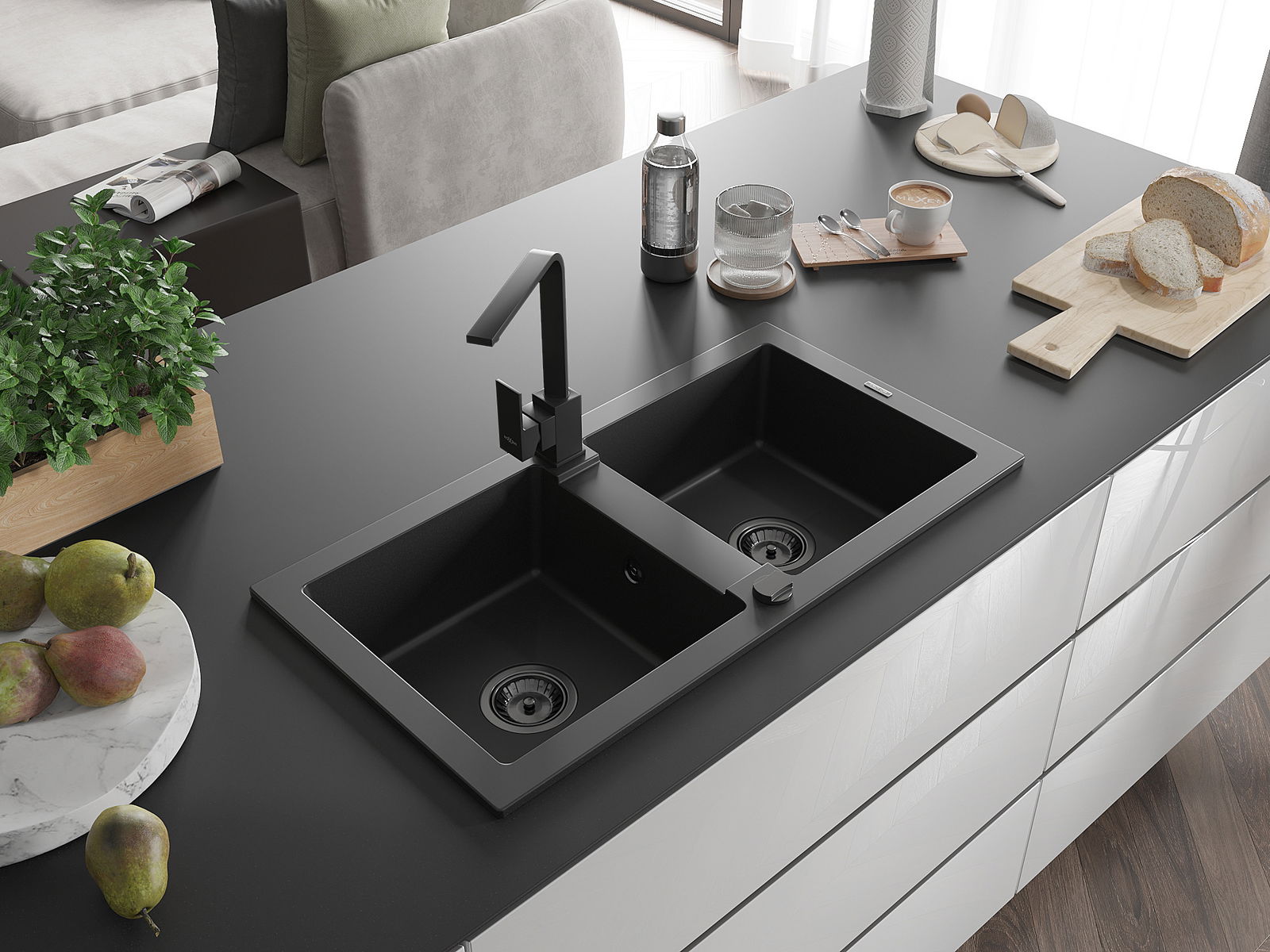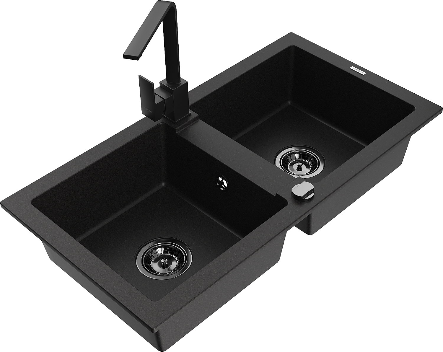 Mexen Mario granitinė dviejų skyrių plautuvė su virtuviniu maišytuvu Rita, juoda - 6504-77-670300-70-B