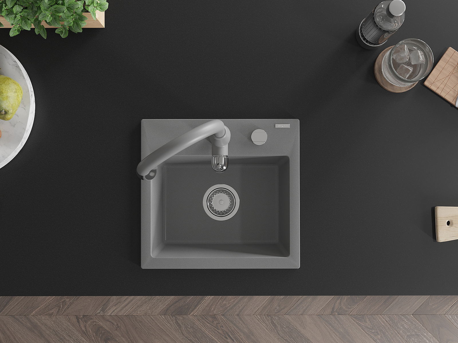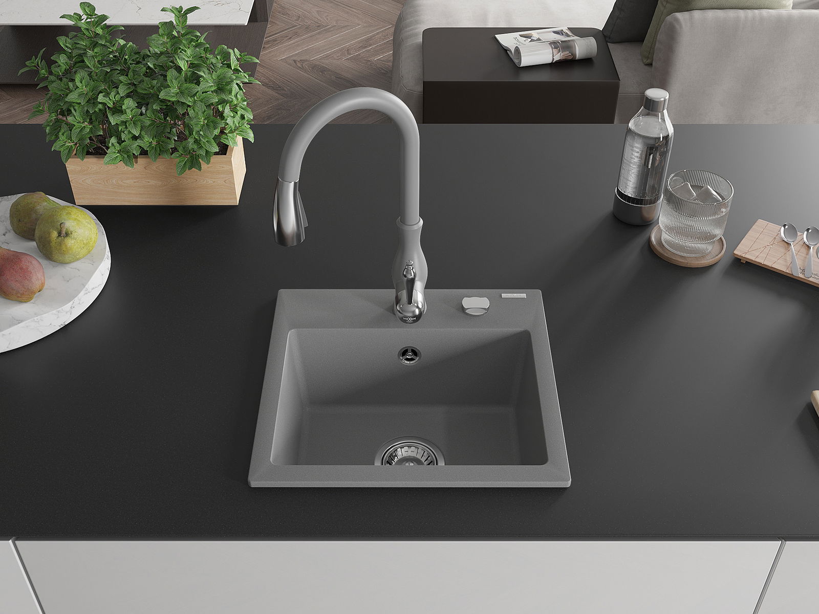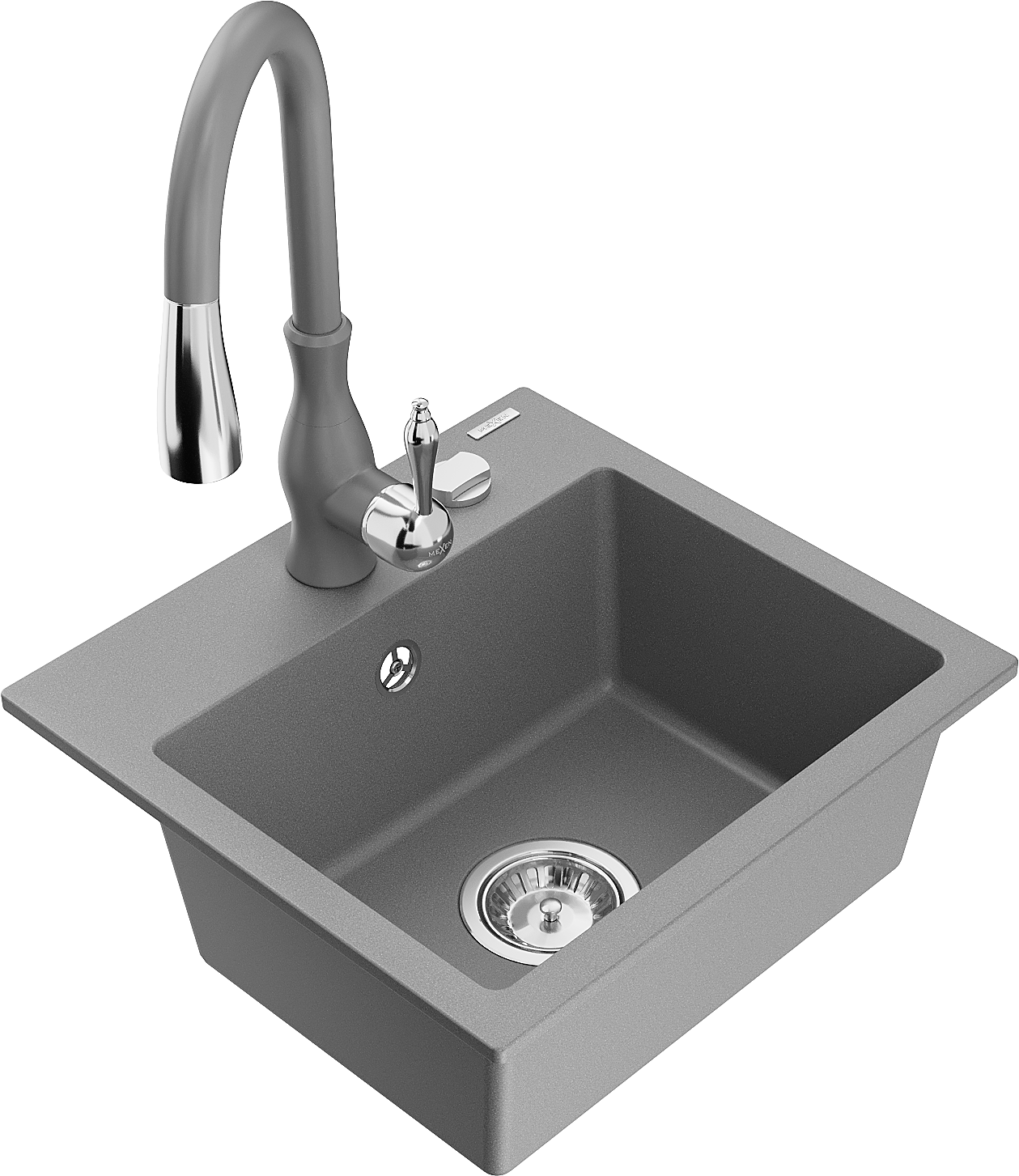 Mexen Milo granito kriauklė su viena kamera ir virtuviniu maišytuvu Savita, pilka - 6505-71-672601-71
