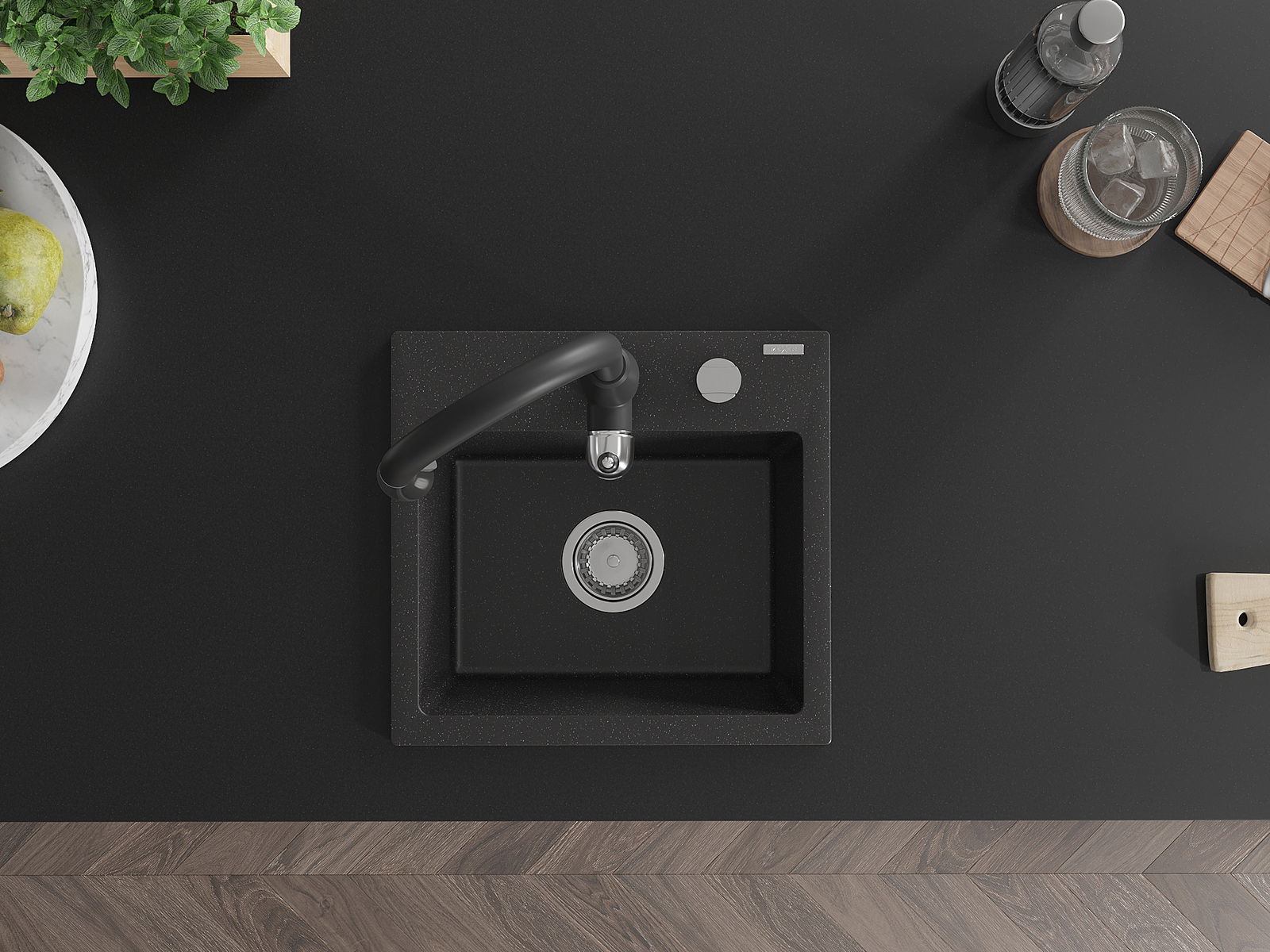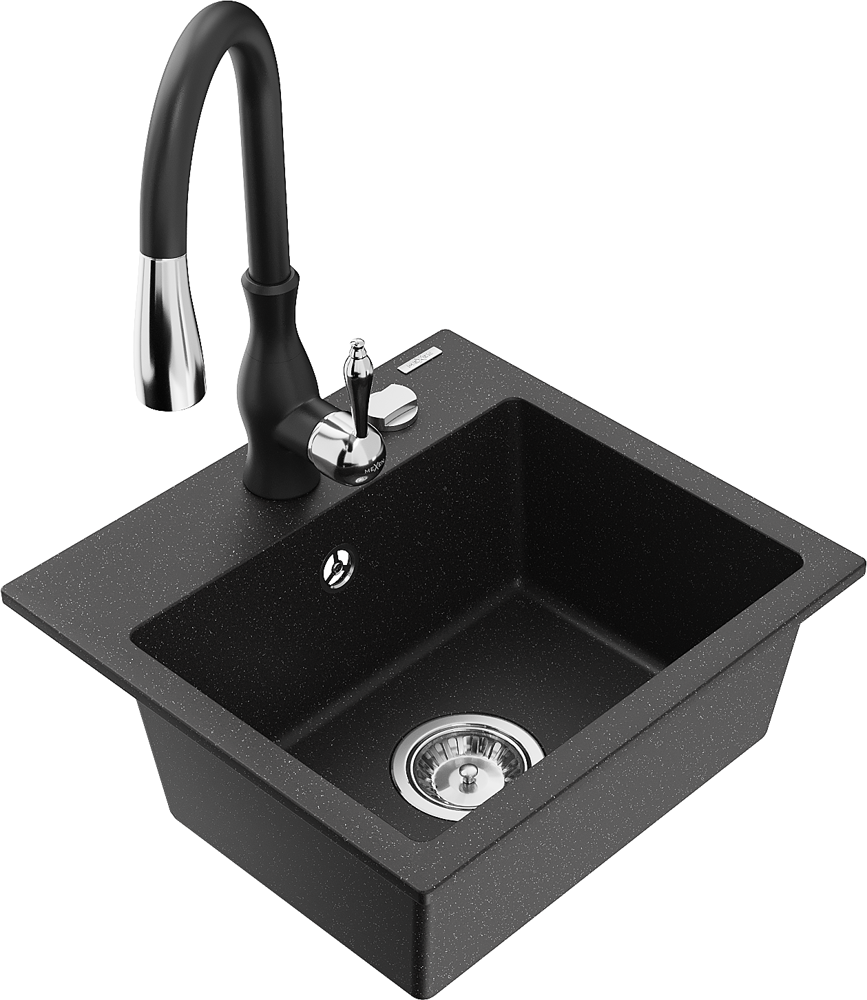 Mexen Milo granitinė vienos talpos kriauklė su virtuviniu maišytuvu Savita, juodas/sidabrinis metalikas- 6505-73-672601-70