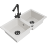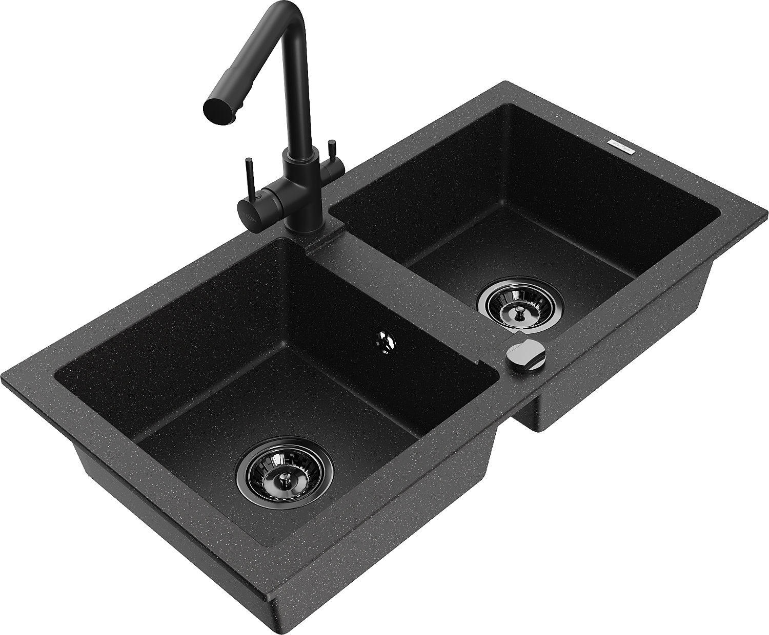 Mexen Mario granitinė dviejų skylių plautuvė su virtuviniu maišytuvu Duero, juoda/sidabrinė metalo spalvos