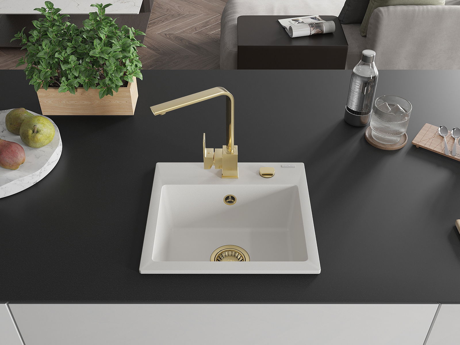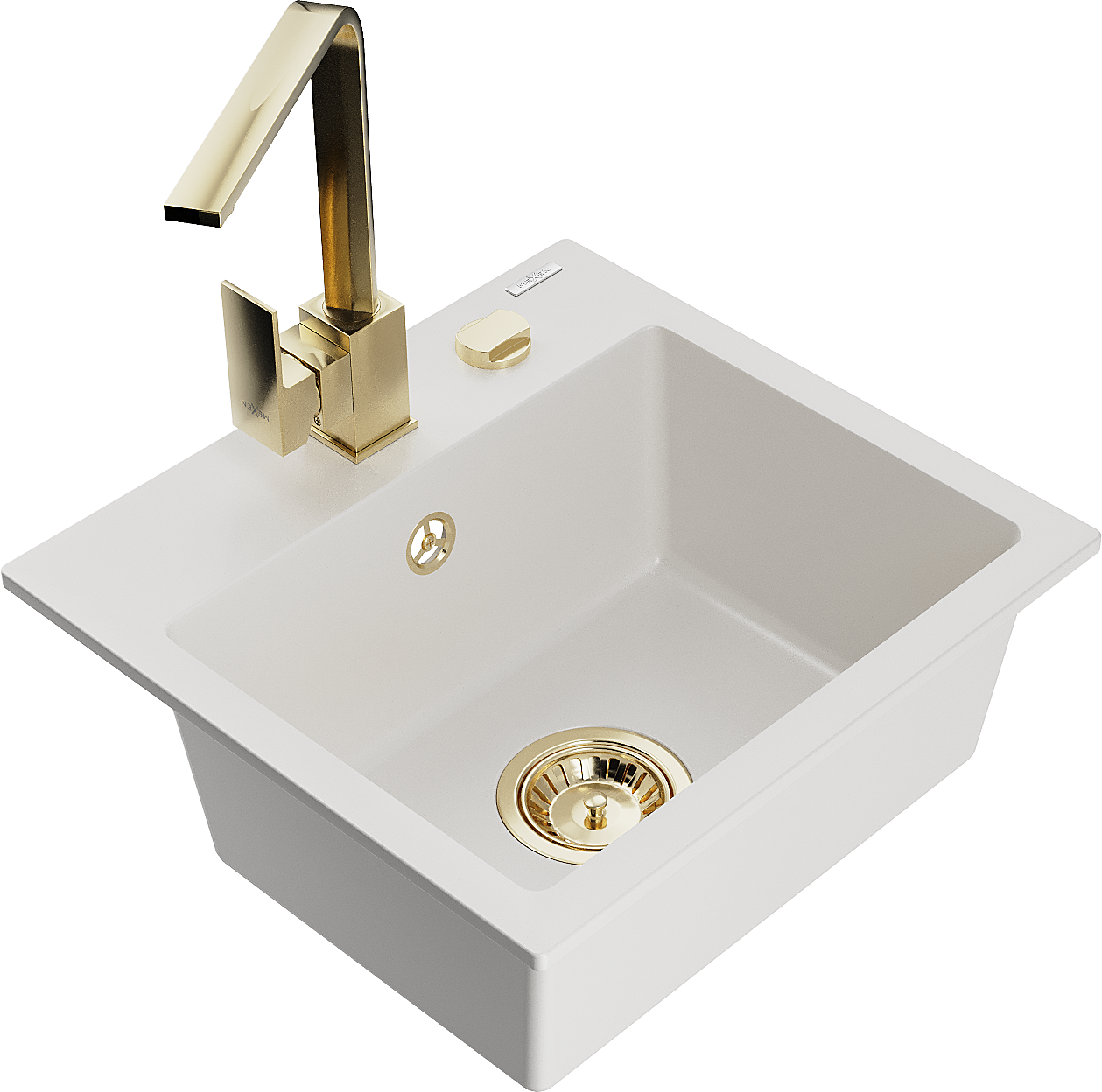 Mexen Milo granitinis vienos kameros plautuvas su virtuviniu maišytuvu Rita, baltas - 6505-20-670300-50