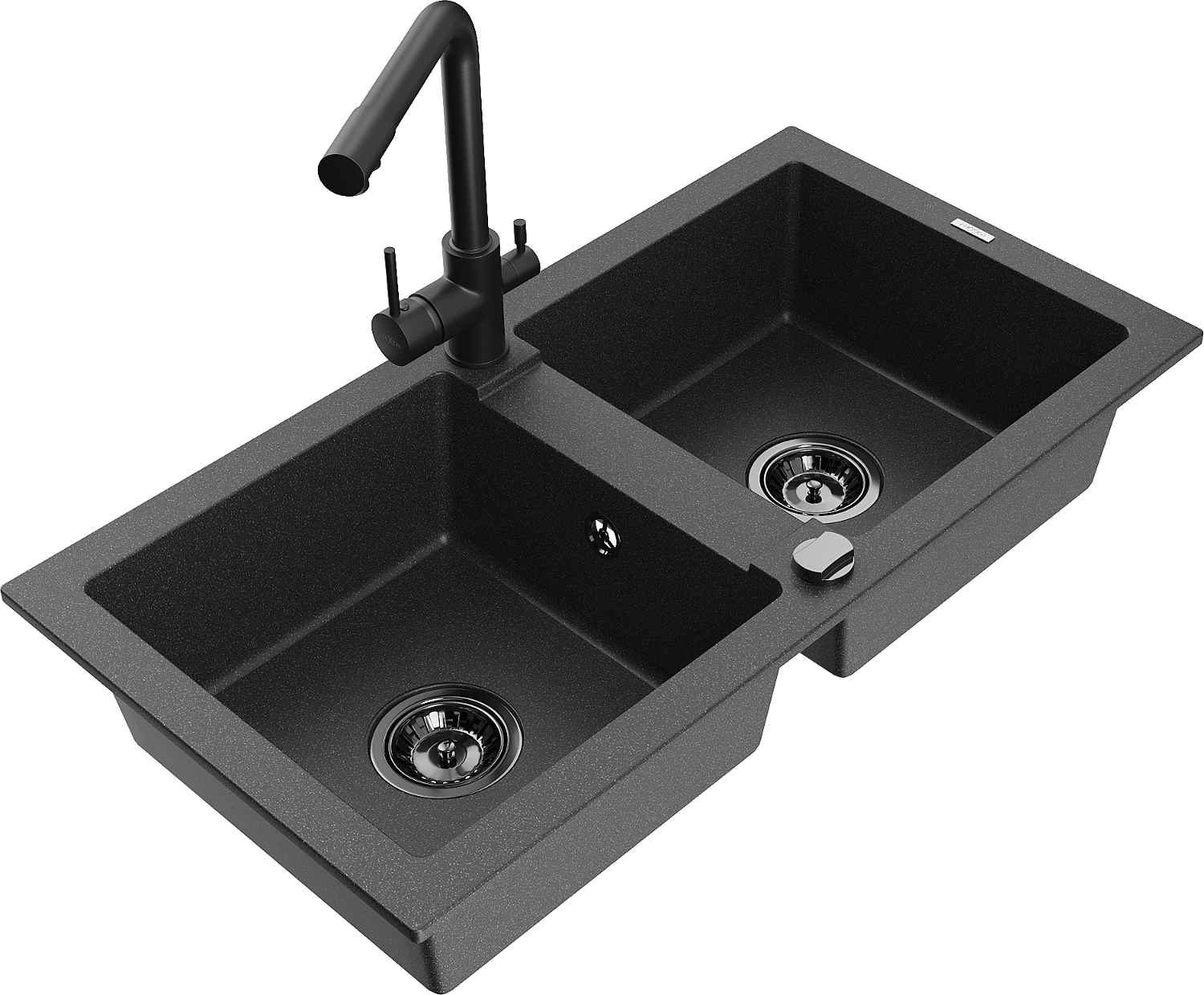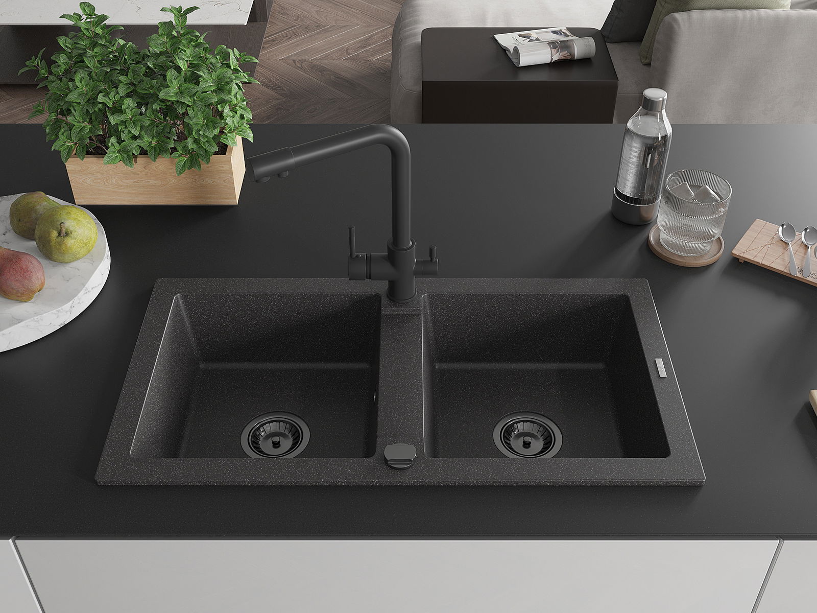 Mexen Mario dviejų kamerų granitinė virtuvės kriauklė su Duero maišytuvu, juodas taškuotas - 6504-76-671600-70-B