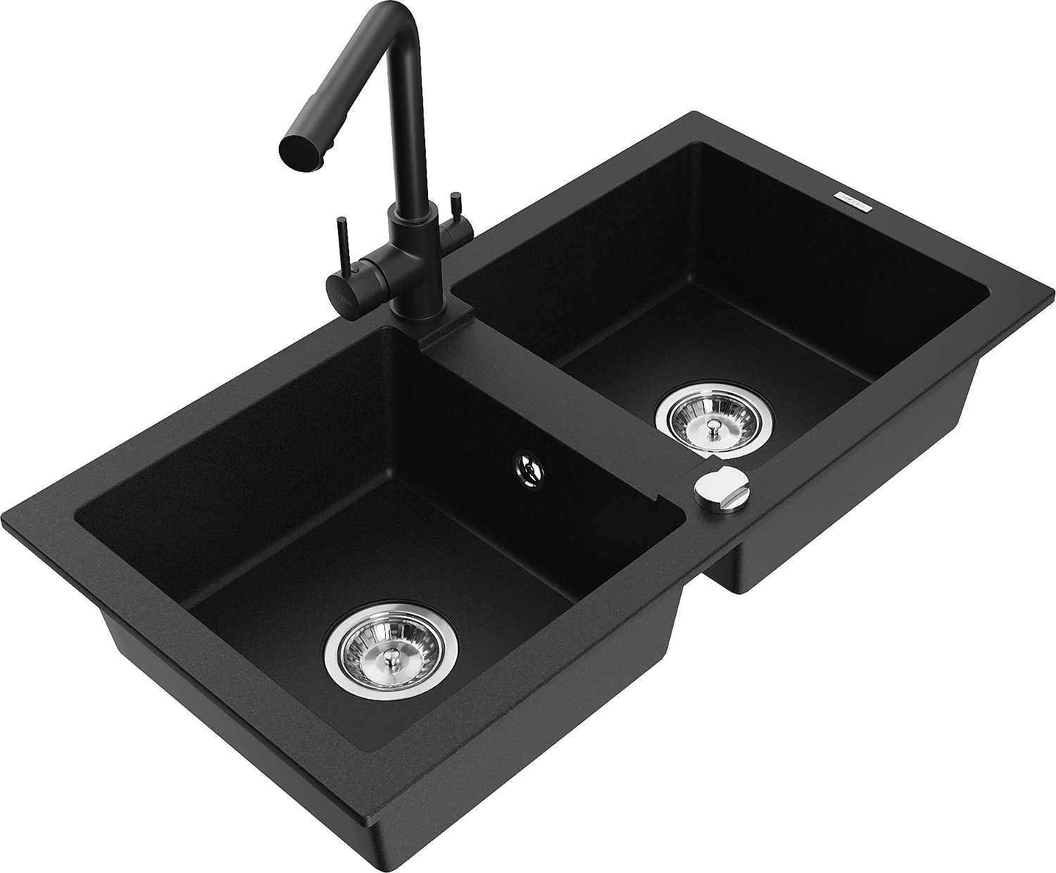 Mexen Mario granitinis dviejų skyrių virtuvės kriauklė su Duero maišytuvu, juodas - 6504-77-671600-70