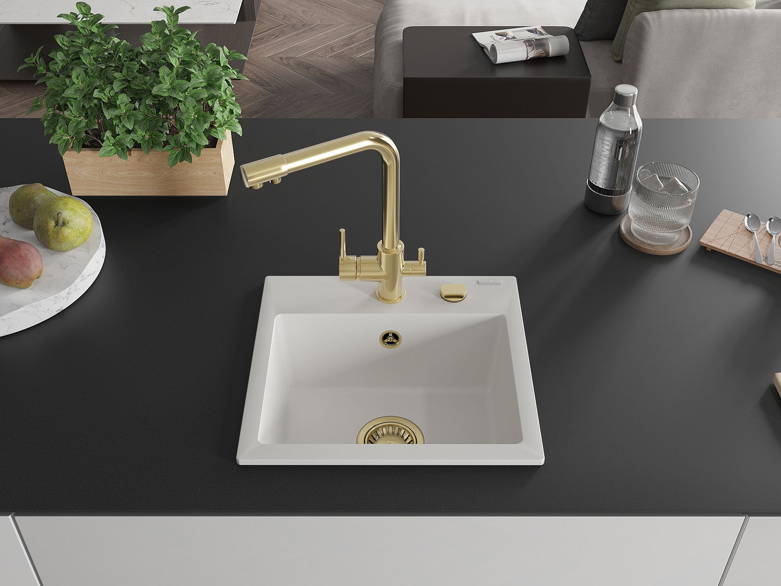 Kriauklė turi išfrezuotą angą, kurios skersmuo 35 mm, kad būtų galima savarankiškai išmušti. Ją galima panaudoti, pvz., montuojant skysto muilo dozatorių, kuris pašalins plastikinių butelių buvimą virtuvėje ir suteiks jai elegantišką apdailą.