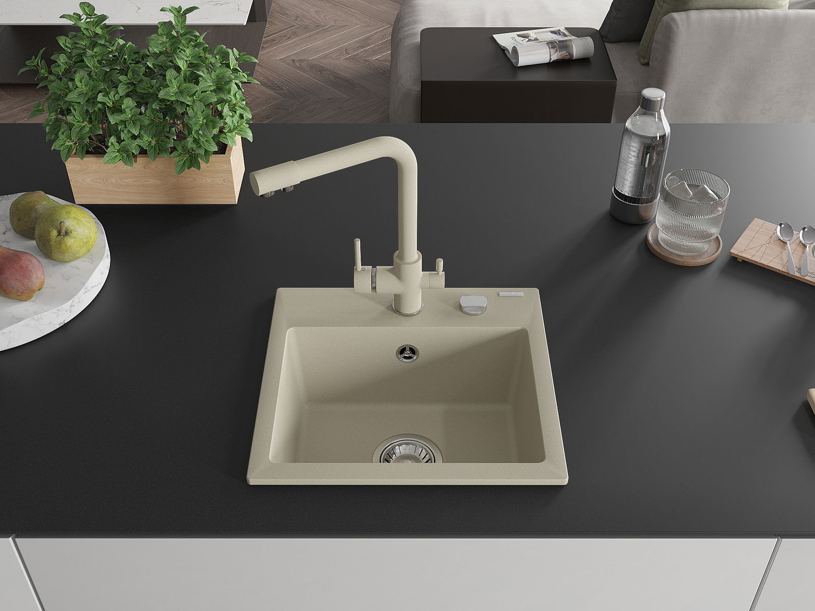Mexen Milo vienos kameros granito kriauklė su Duero virtuviniu maišytuvu, smėlio spalvos - 6505-69-671600-69