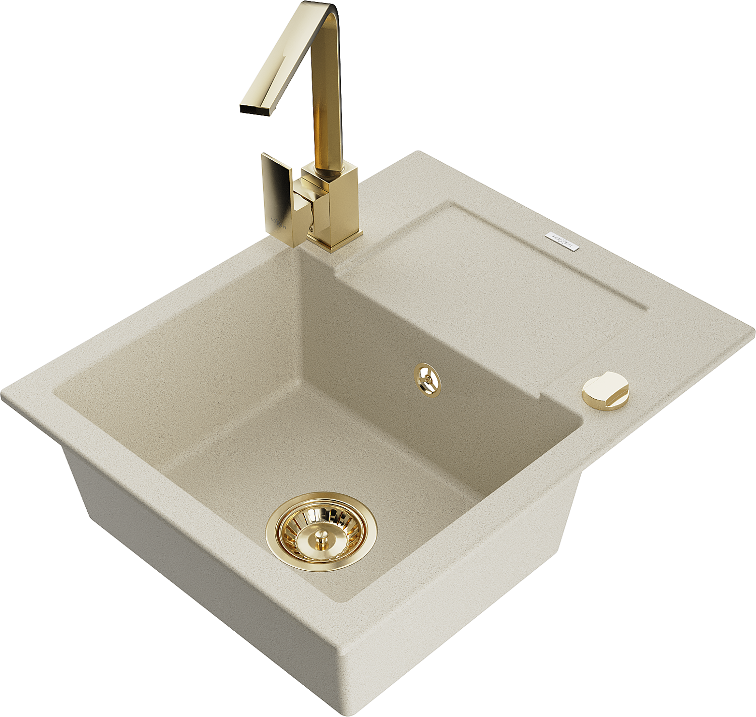 Mexen Enzo granito plautuvė 1-dubens su nutekėjimu ir virtuviniu maišytuvu Rita, smėlio spalvos - 6506-69-670300-50