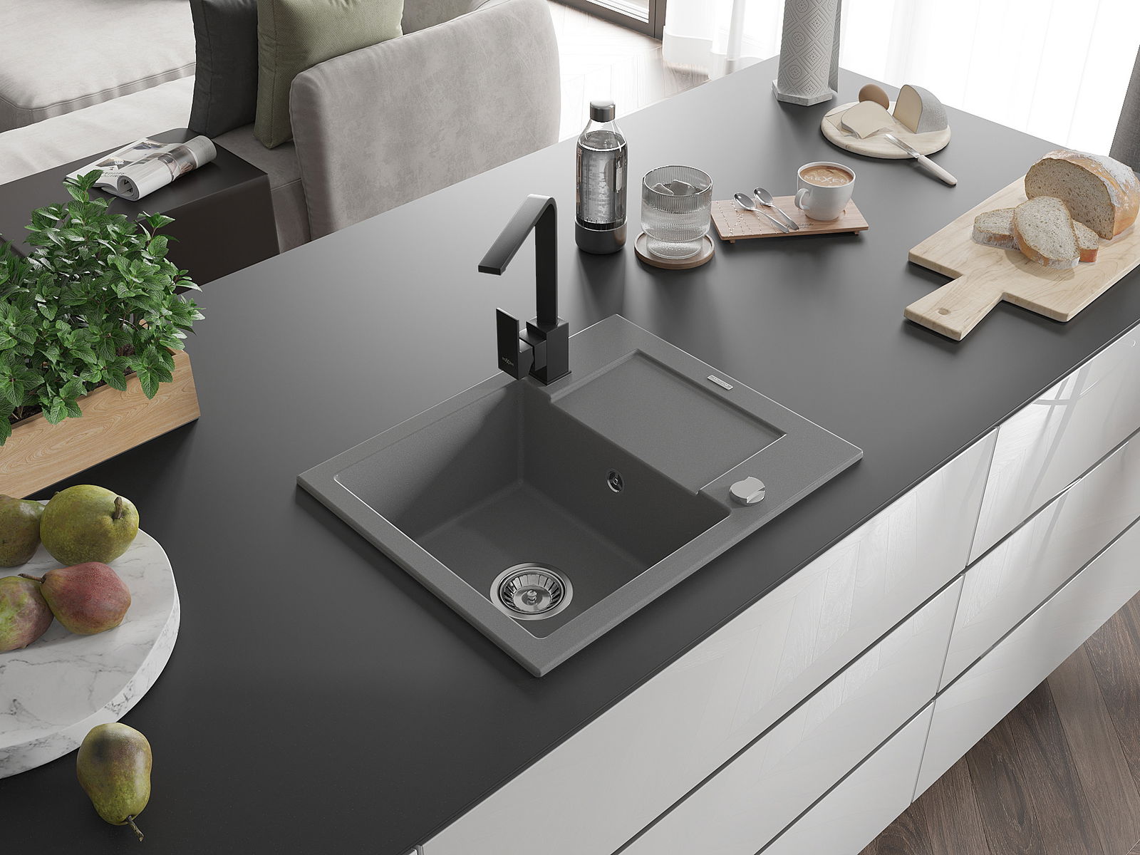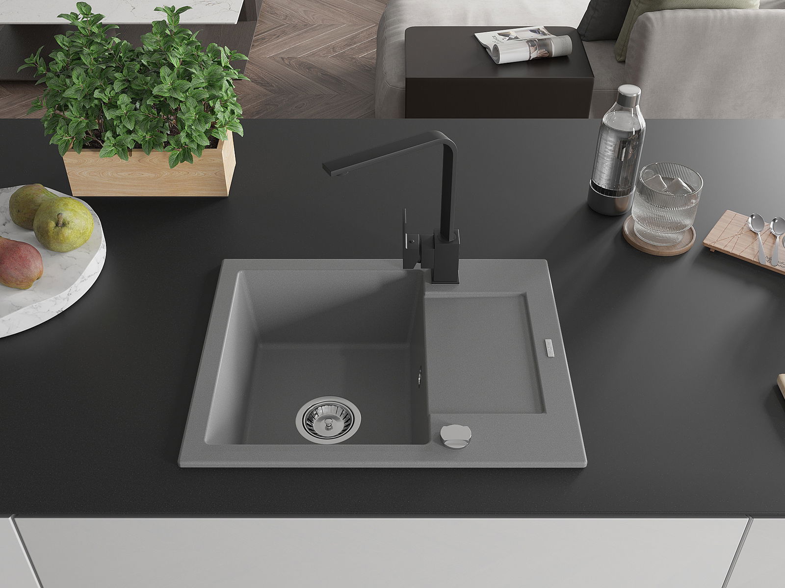 Mexen Enzo vienos komoros granitinė kriauklė su drenažu ir virtuves maišytuvu Rita, pilka - 6506-71-670300-70