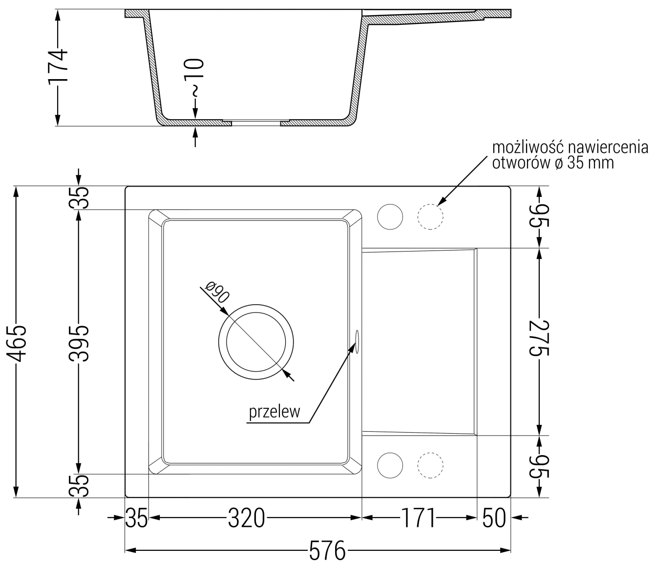 Kriauklė turi 2 iš anksto frezuotas skyles, kurių skersmuo yra 35 mm, skirtas savarankiškam išmušimui. Jas galima naudoti, pavyzdžiui, skysčio dozatoriaus montavimui, kuris pašalins plastikinių butelių buvimą virtuvėje ir suteiks jai elegantišką apdailą.