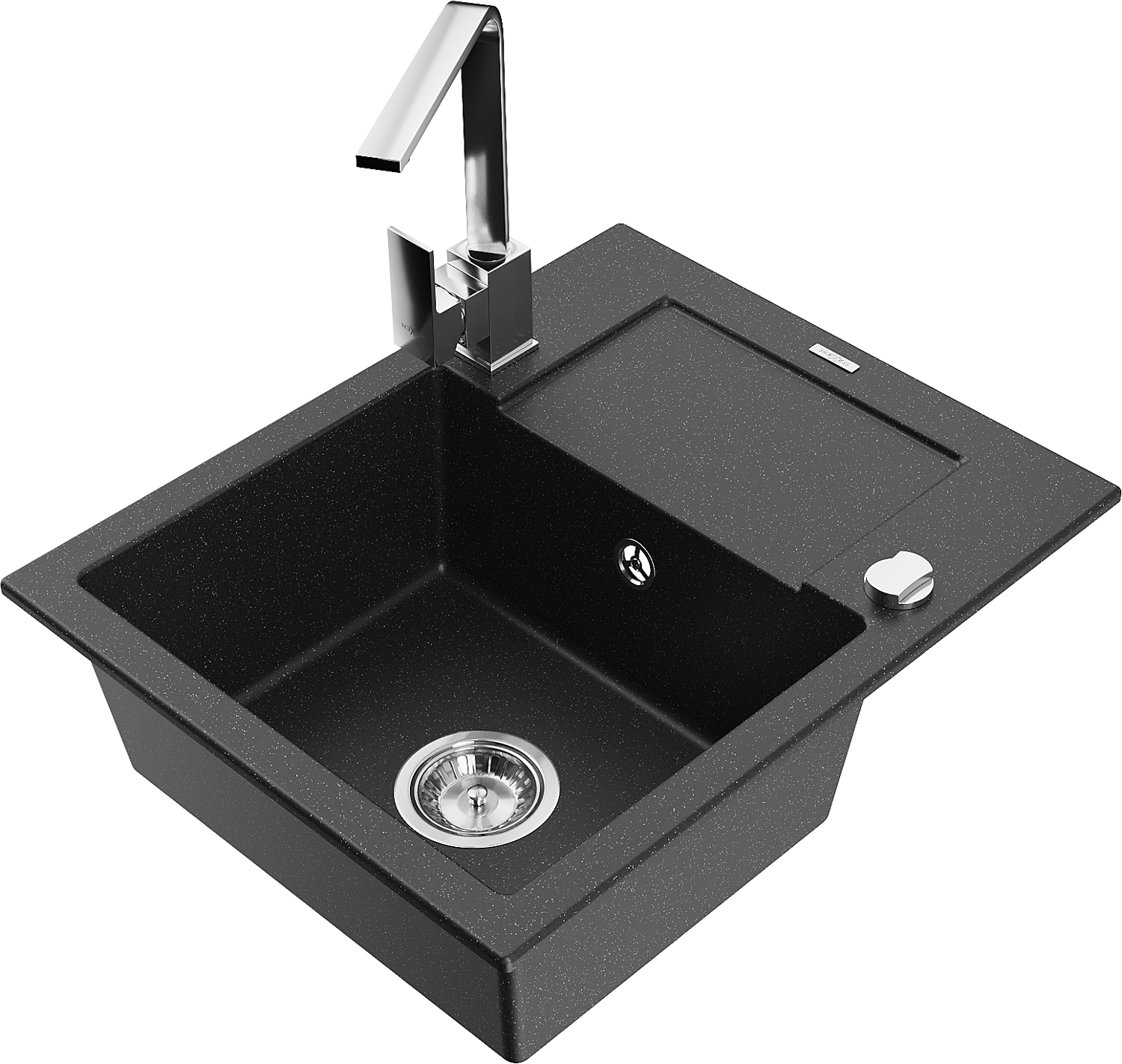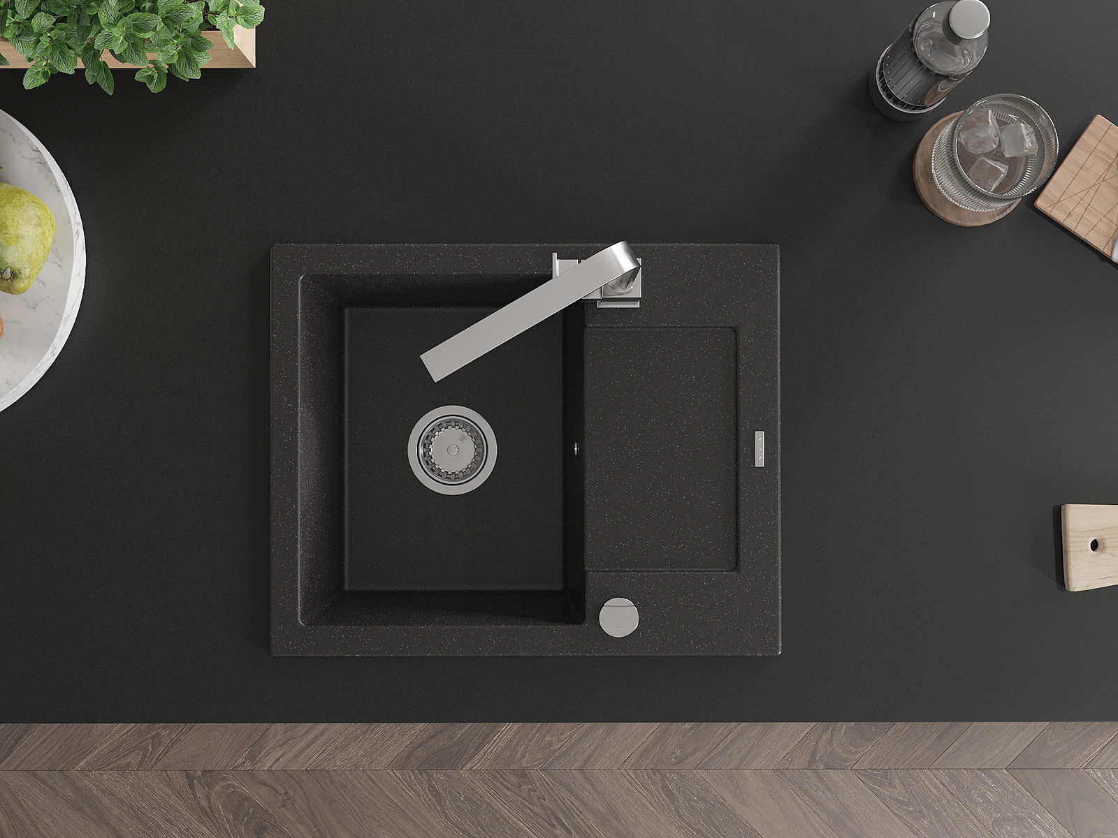 Mexen Enzo granitinė vienos kriauklės plautuvė su drenažu ir virtuvės maišytuvu Rita, juodos/sidabrinės metaliko spalvos