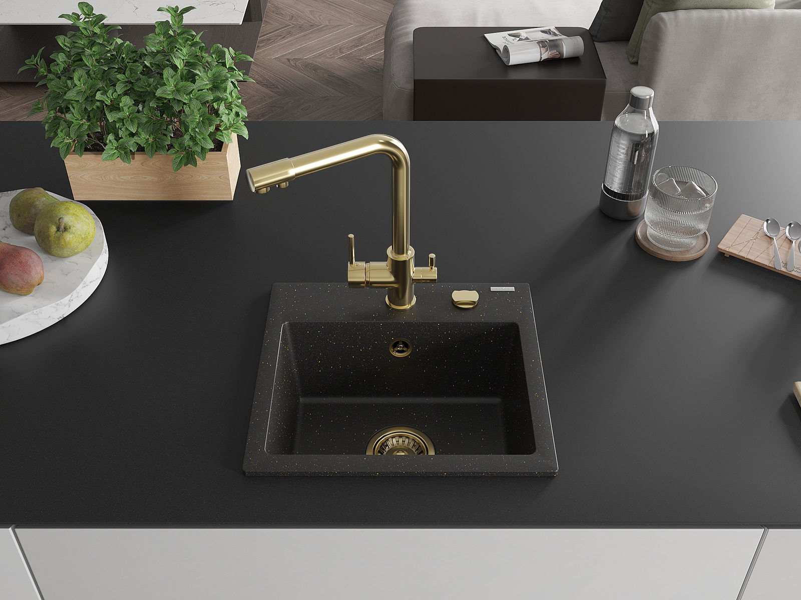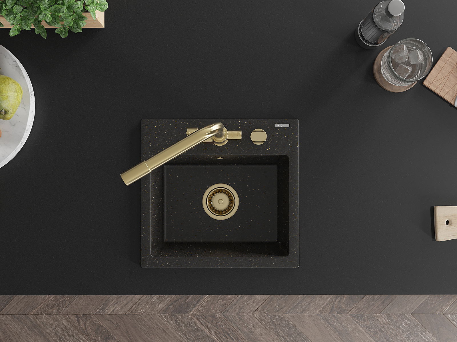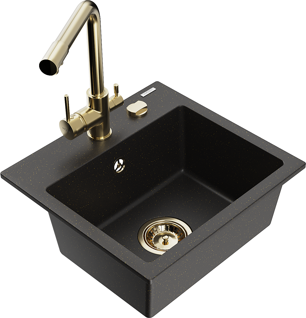 Mexen Milo granitinė vienaaukštė virtuvės kriauklė su virtuviniu maišytuvu Duero, juodas/auksinis metalikas - 6505-75-671600-50