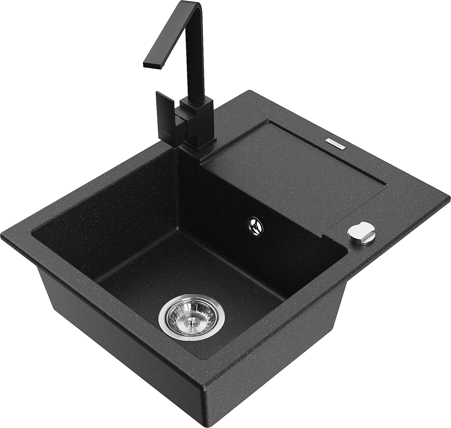 Mexen Enzo granitinė vienos kameros kriauklė su sausinimo lentyna ir virtuviniu maišytuvu Rita, juoda/sidabrinė metalika