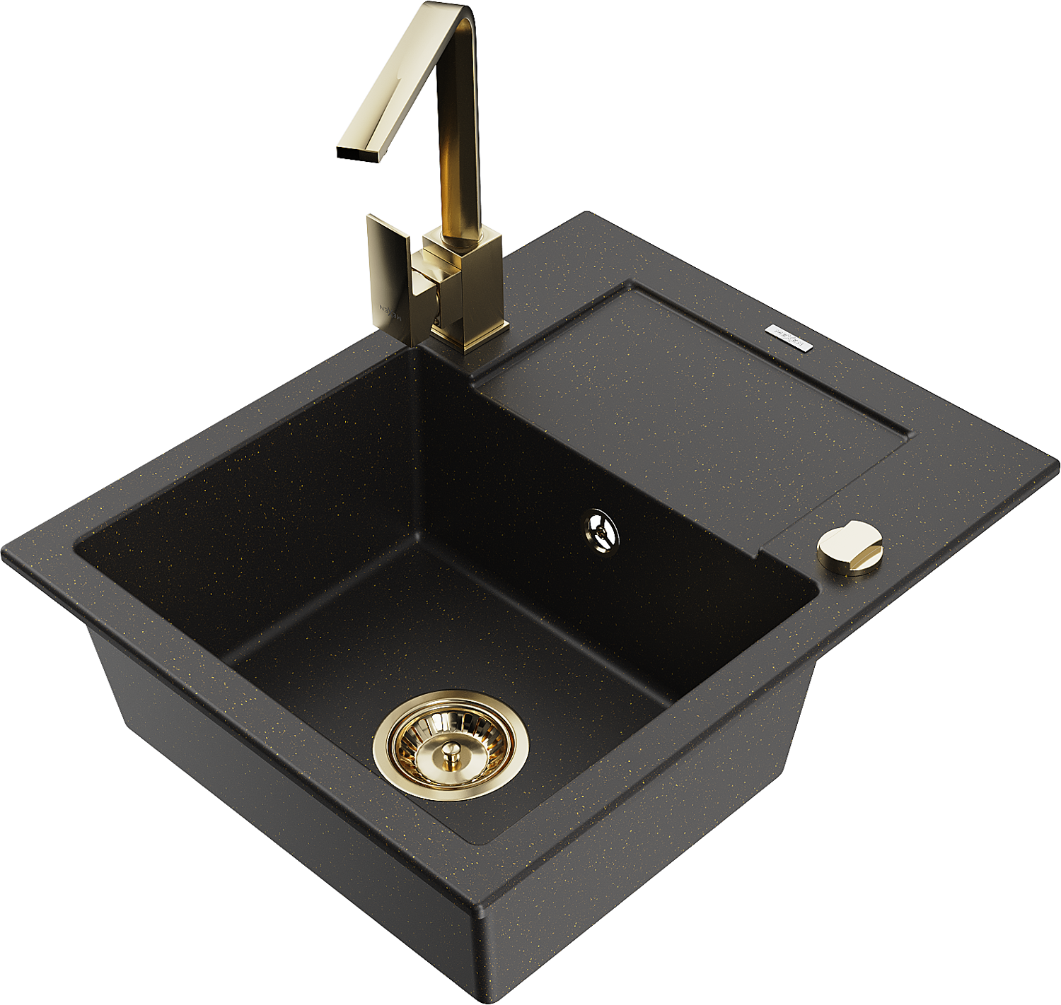 Mexen Enzo vientisas granito kriauklė su nutekėjimu ir virtuvės maišytuvu Rita, juoda/auksinis metalikas - 6506-75-670300-50