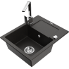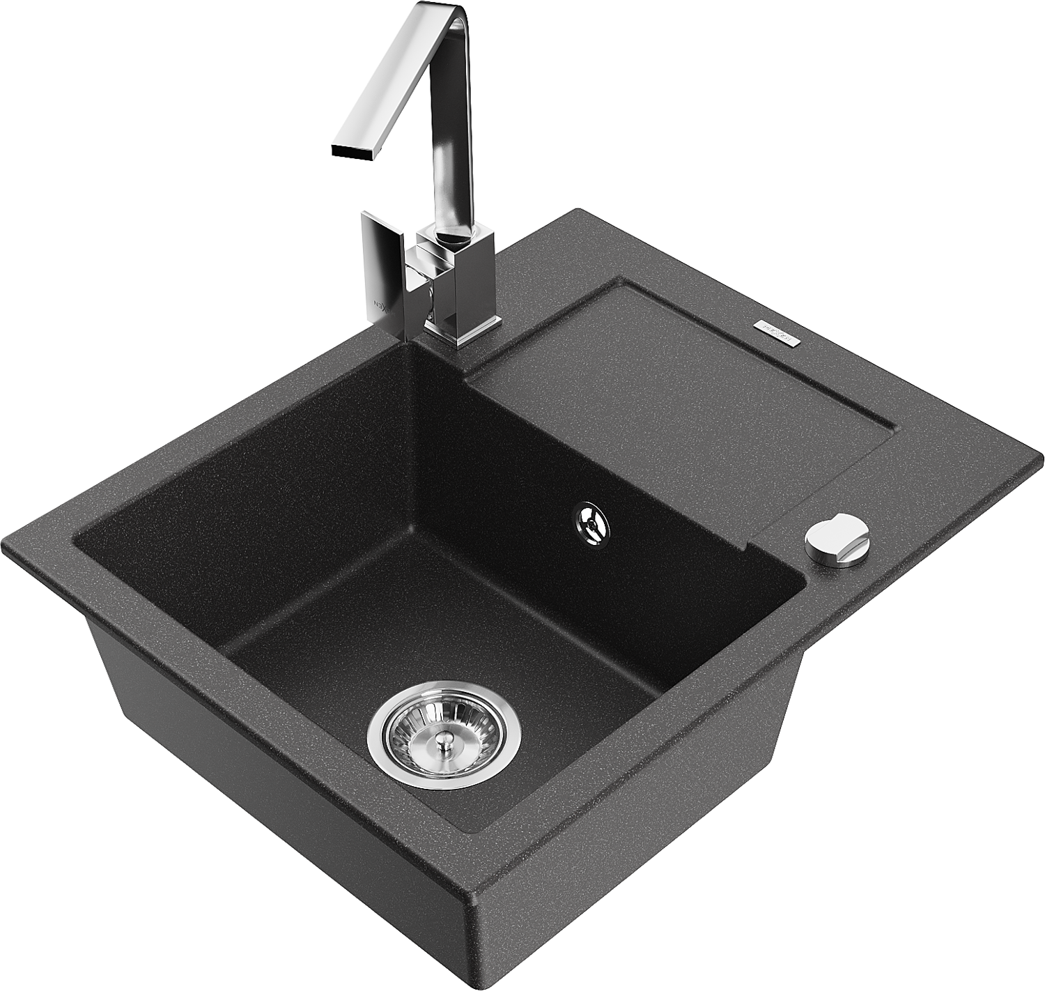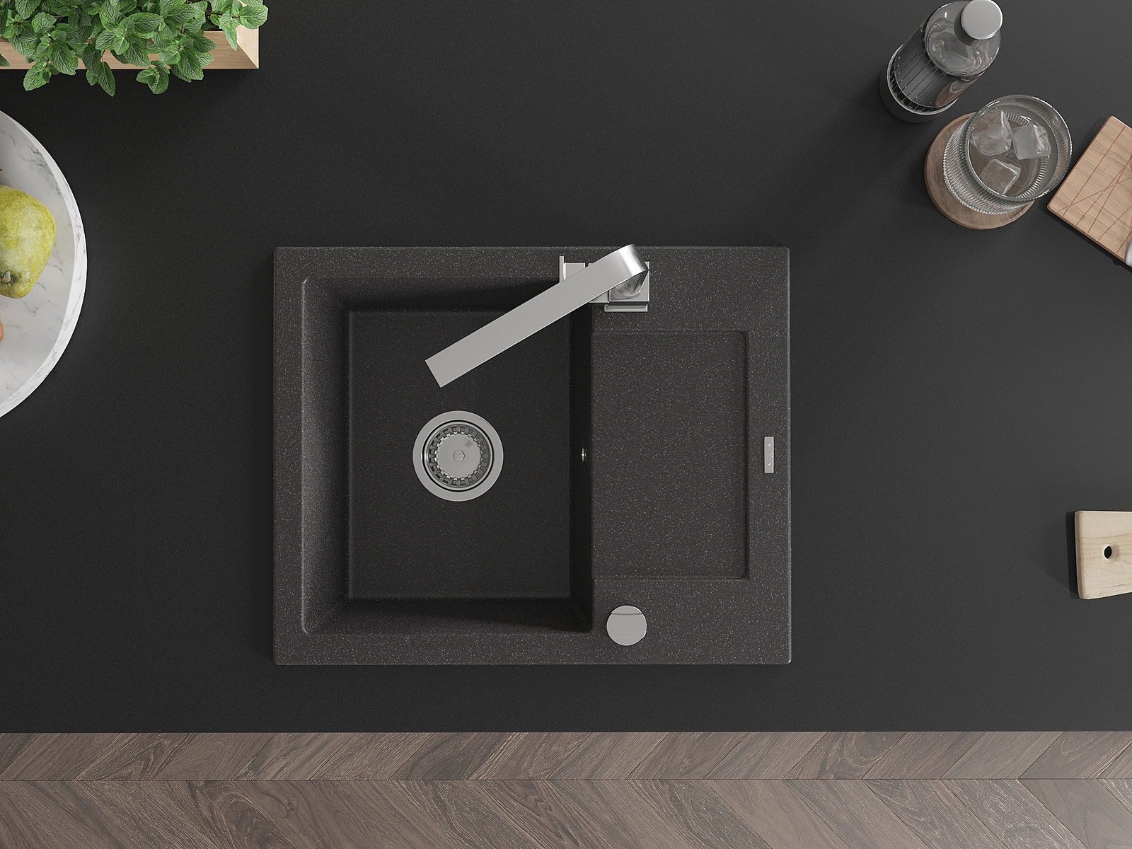 Mexen Enzo granitinė vienos sekcijos plautuvė su nusausinimo zona ir virtuviniu maišytuvu Rita, juodos spalvos su taškeliais