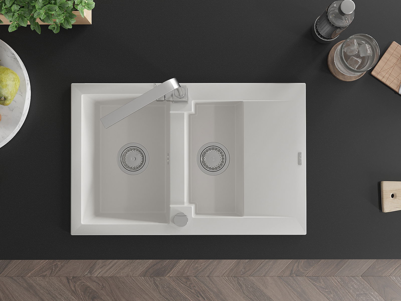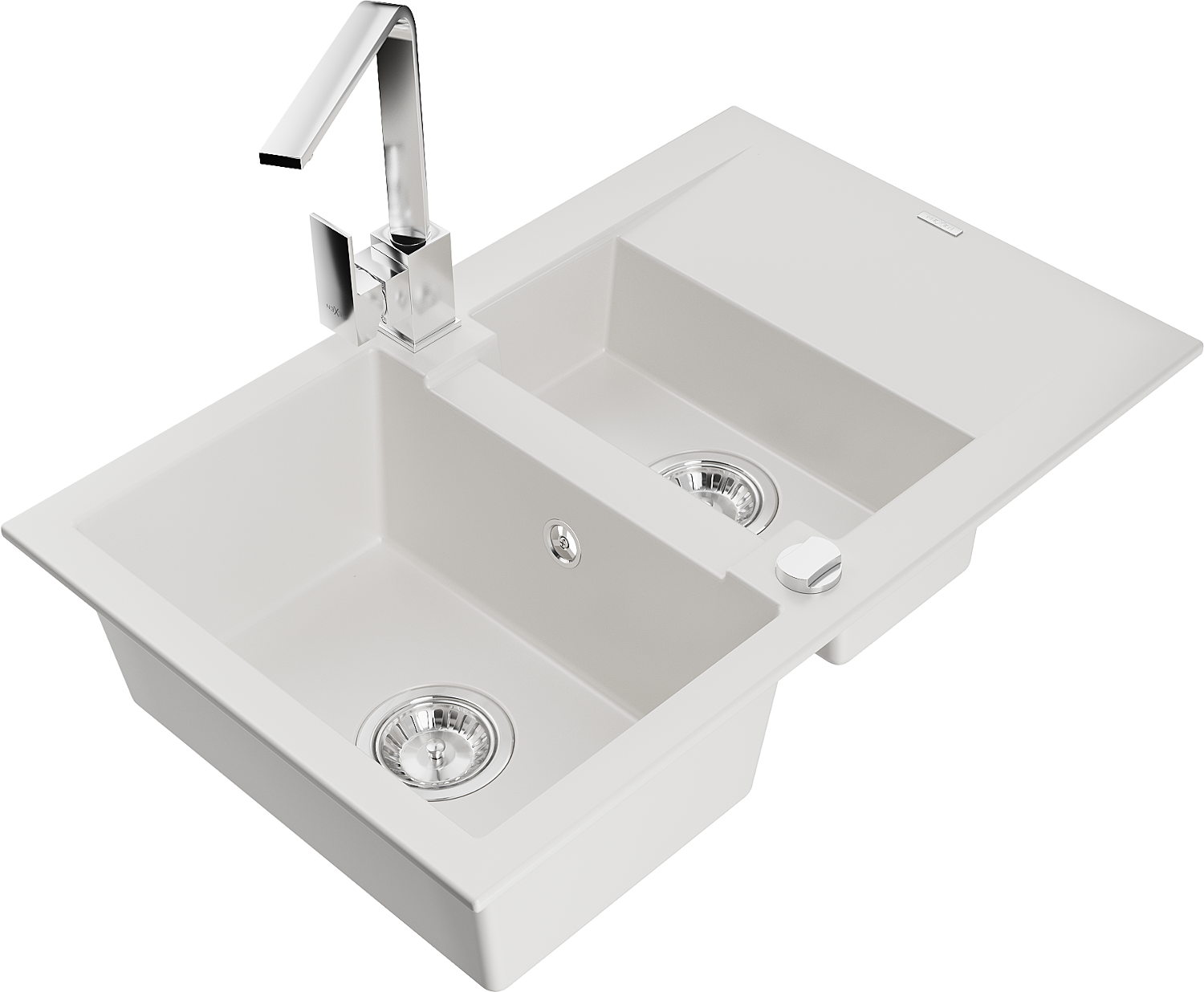 Mexen Gaspar granito plautuvė 1,5 kamerų su lašintuvu ir virtuviniu maišytuvu Rita, balta - 6507-20-670300-00