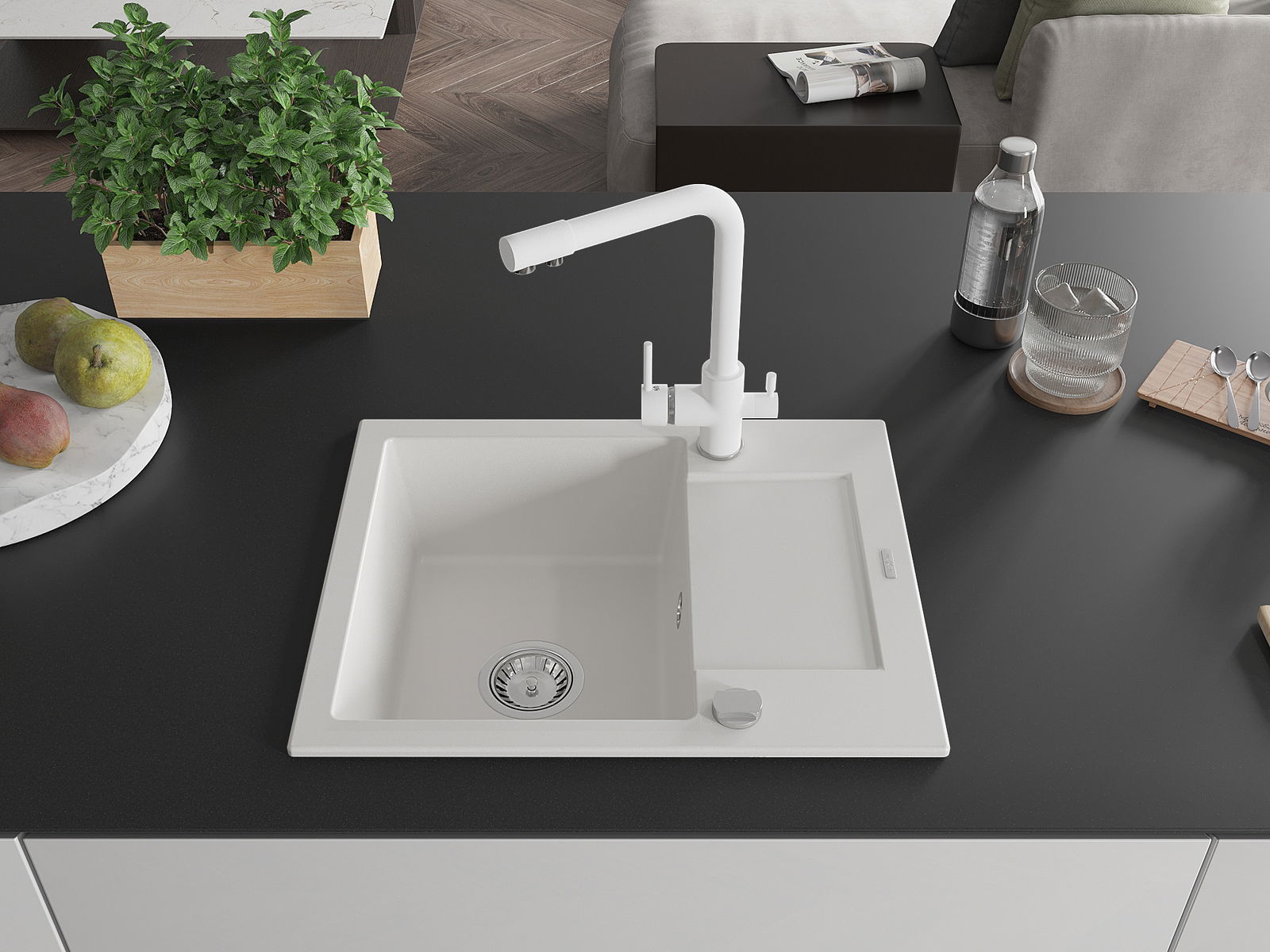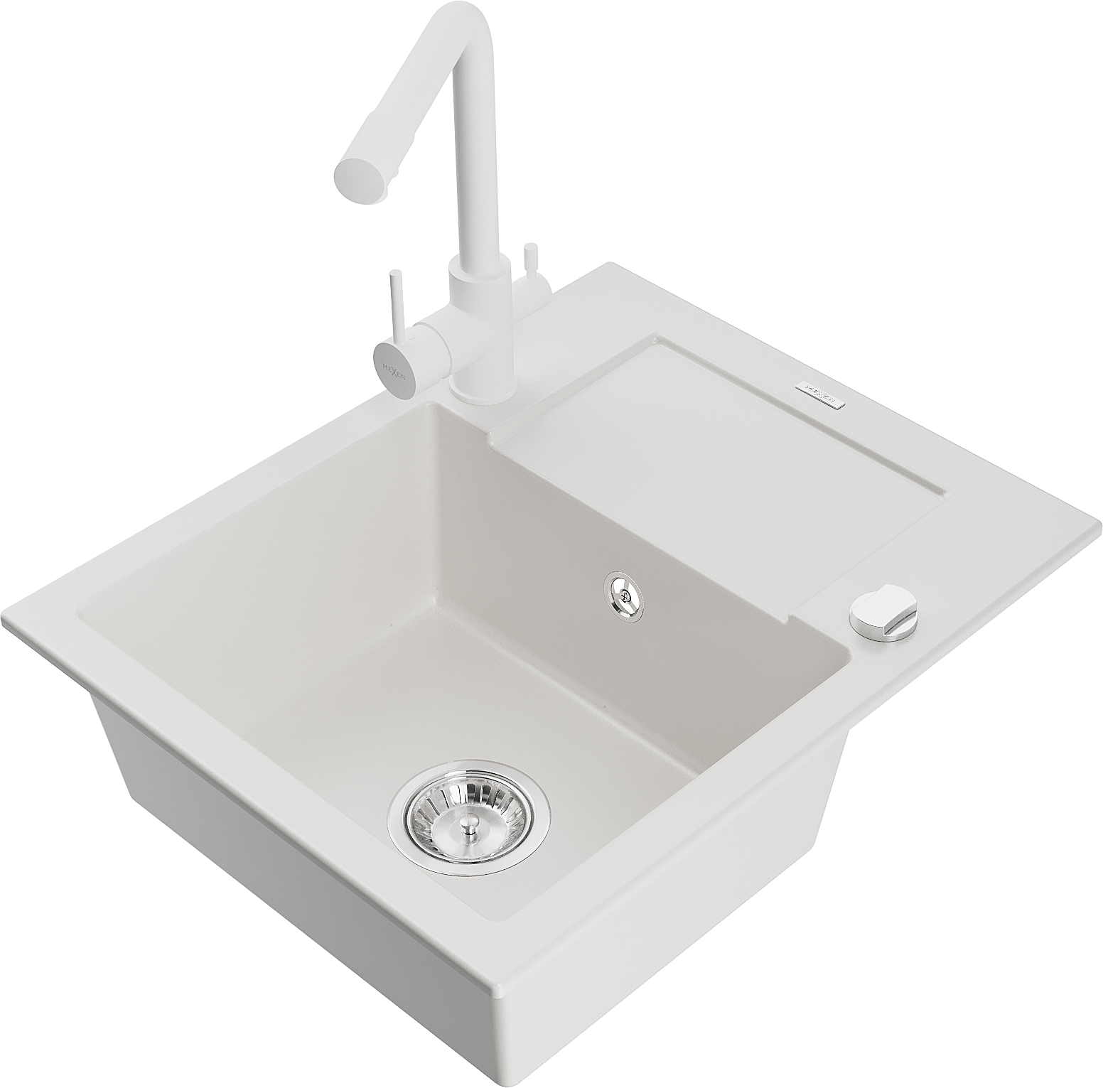 Mexen Enzo granitinė vienos plautuvės kriauklė su nubėgimo zona ir Duero virtuviniu maišytuvu, balta - 6506-20-671600-20