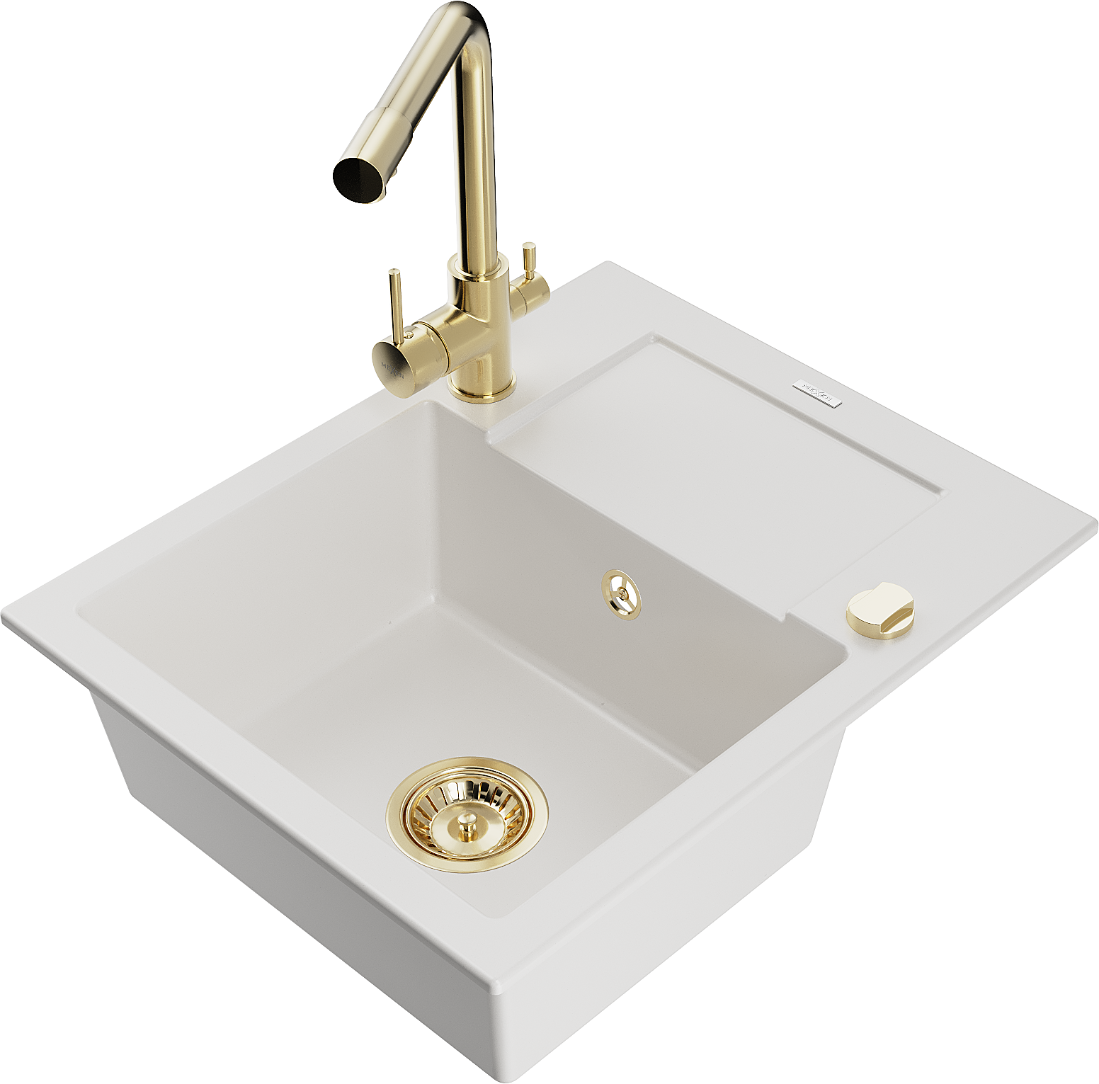 Mexen Enzo granitinė vienos kameros kriauklė su nutekėjimo plokštele ir virtuviniu maišytuvu Duero, balta - 6506-20-671600-50