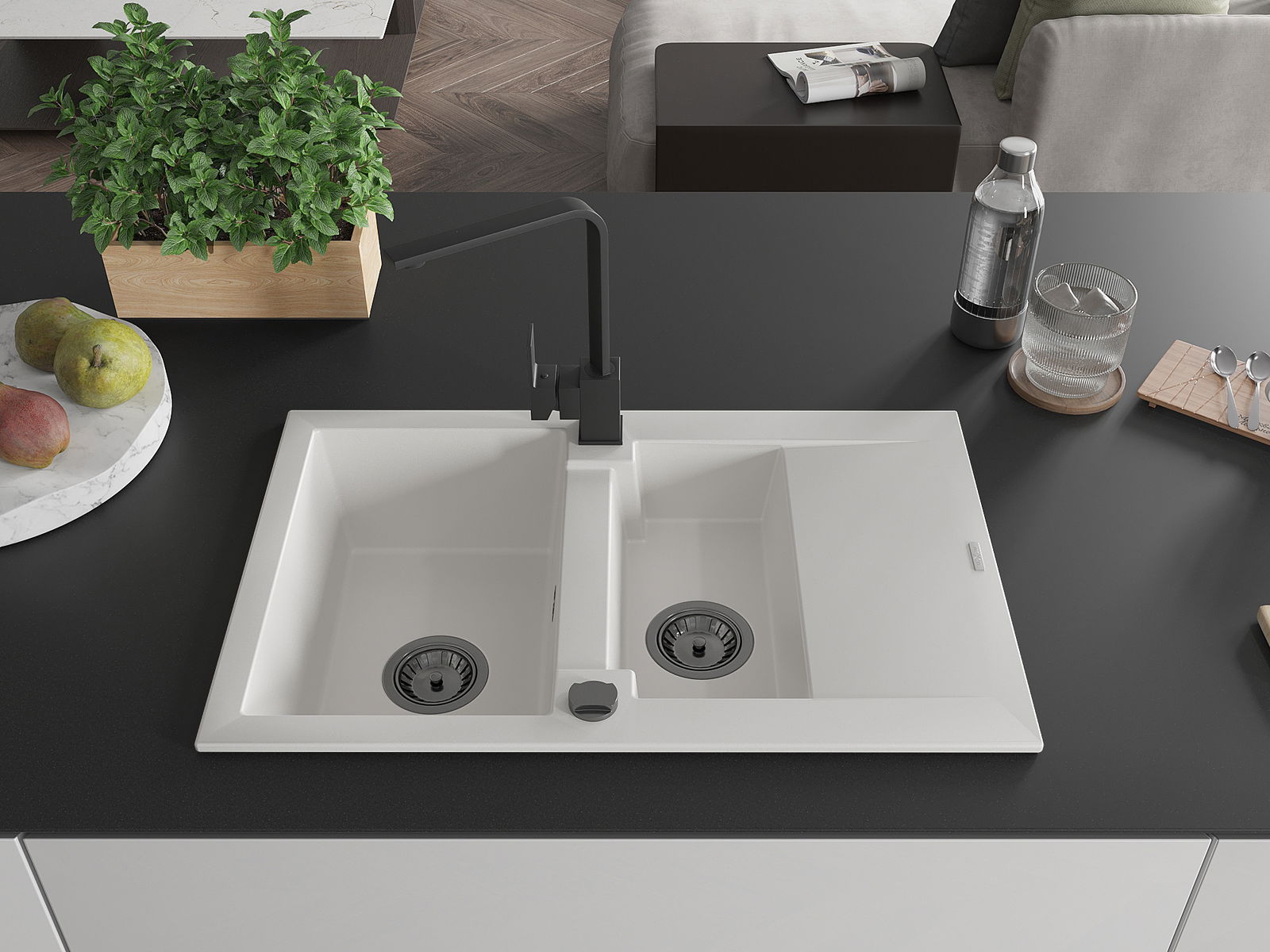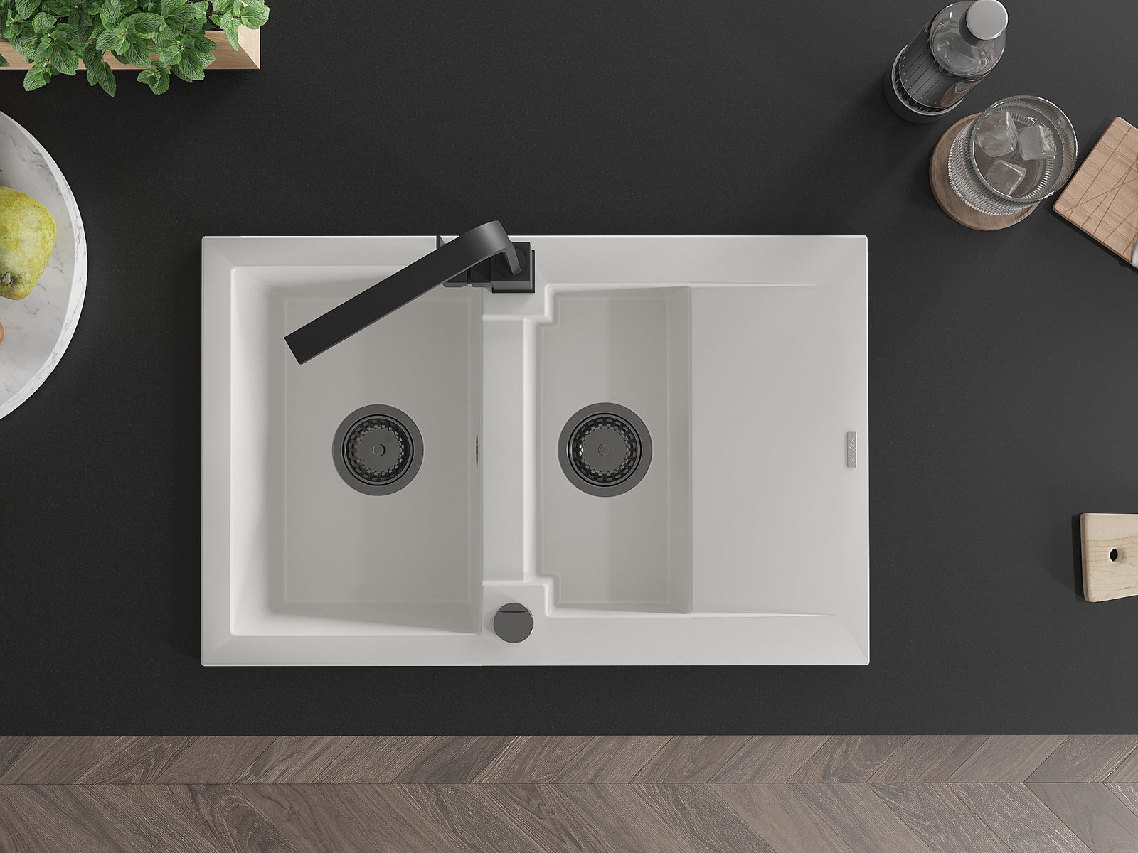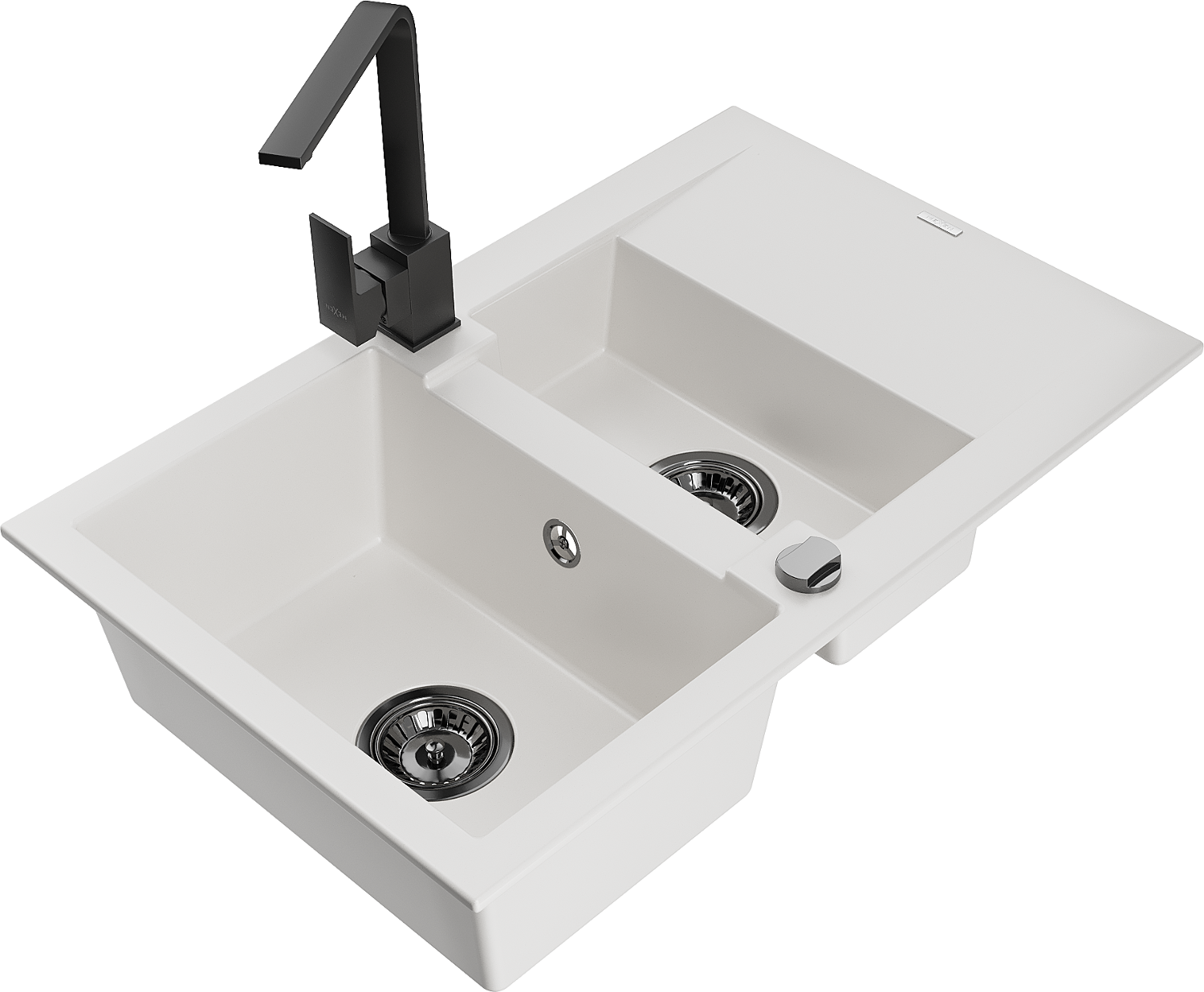 Mexen Gaspar granito plautuvė 1,5 skylių su varvekliu ir virtuviniu maišytuvu Rita, baltas - 6507-20-670300-70