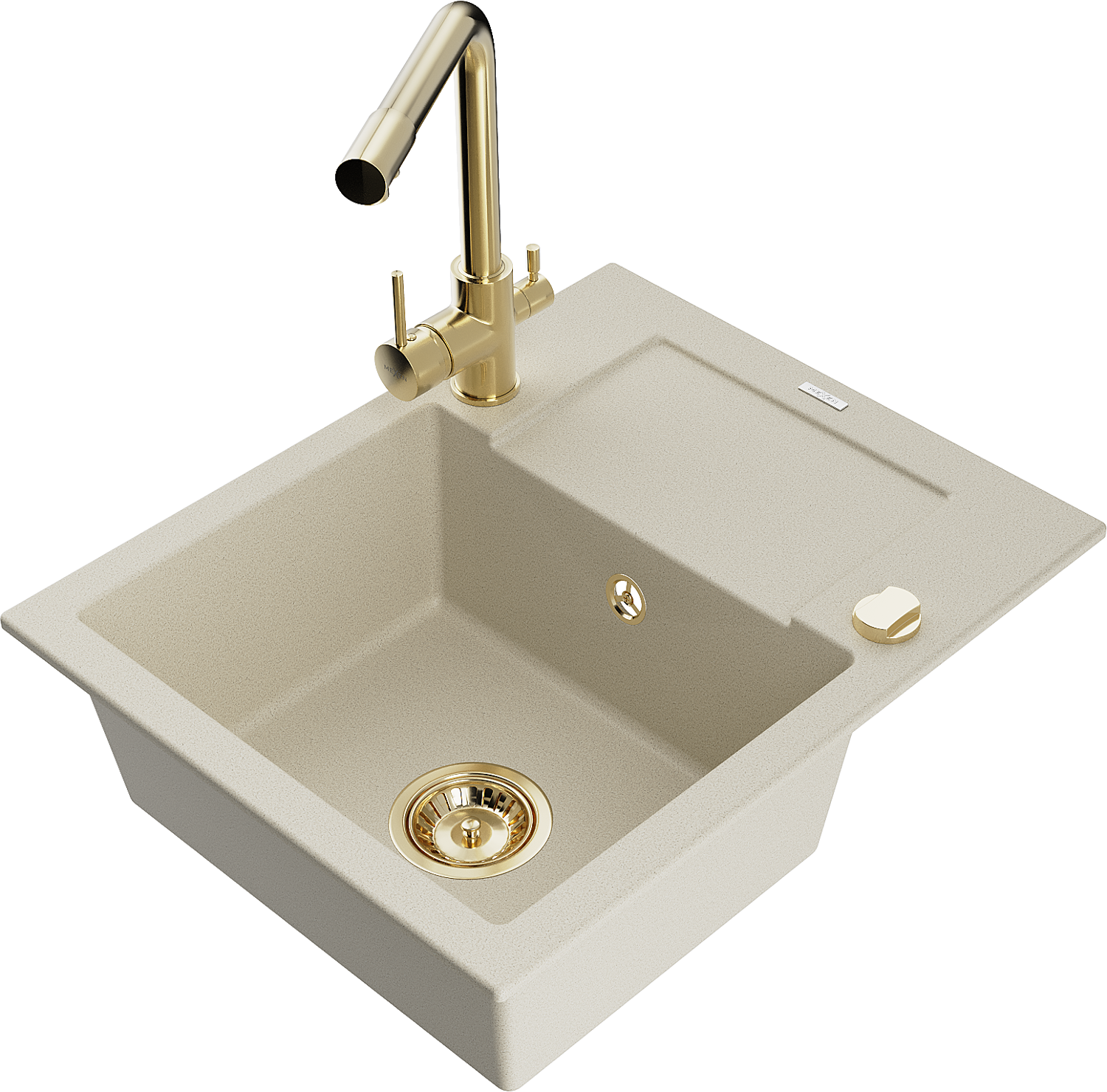 Mexen Enzo granitinė vienos dubens kriauklė su nusausintuvu ir virtuvės čiaupu Duero, smėlio spalvos - 6506-69-671600-50