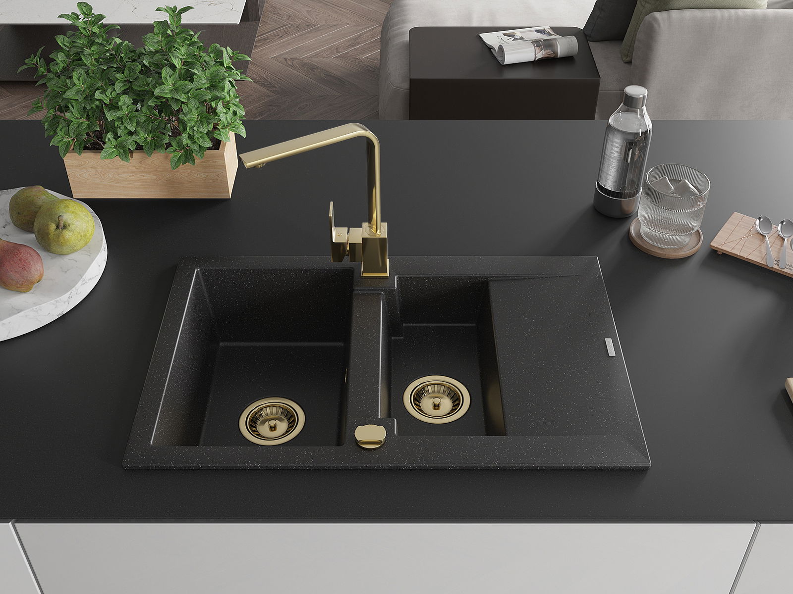 Mexen Gaspar granitinė kriauklė 1,5 kameros su nutekamu ir virtuvės maišytuvu Rita, juoda/sidabrinė metalo - 6507-73-670300-50