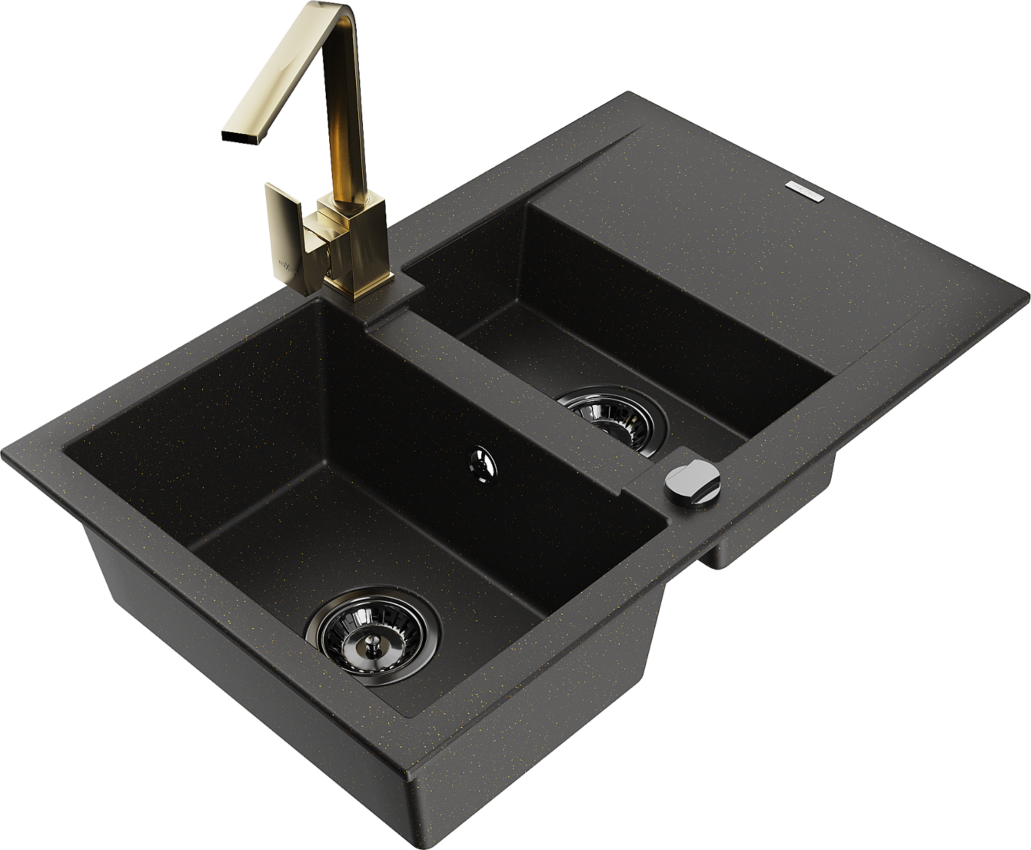 Mexen Gaspar granito kriauklė su 1,5 plautuvėmis ir nusausintuvu bei virtuviniu maišytuvu Rita, juoda/auksinė - 6507-75-670300-?