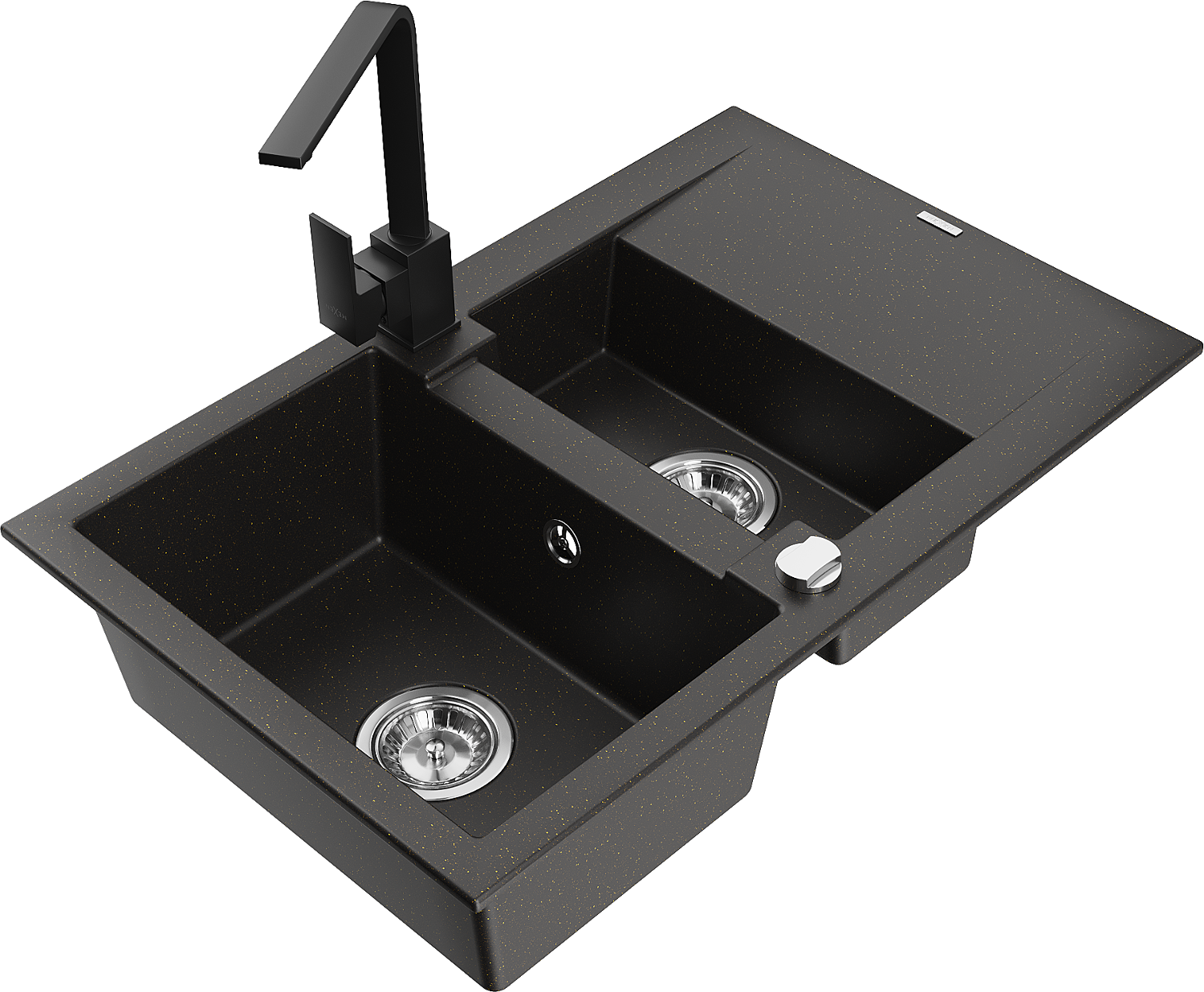 Mexen Gaspar granitinė 1,5 skylių plautuvė su drenažu ir virtuviniu maišytuvu Rita, juoda/aukso - 6507-75-670300-70