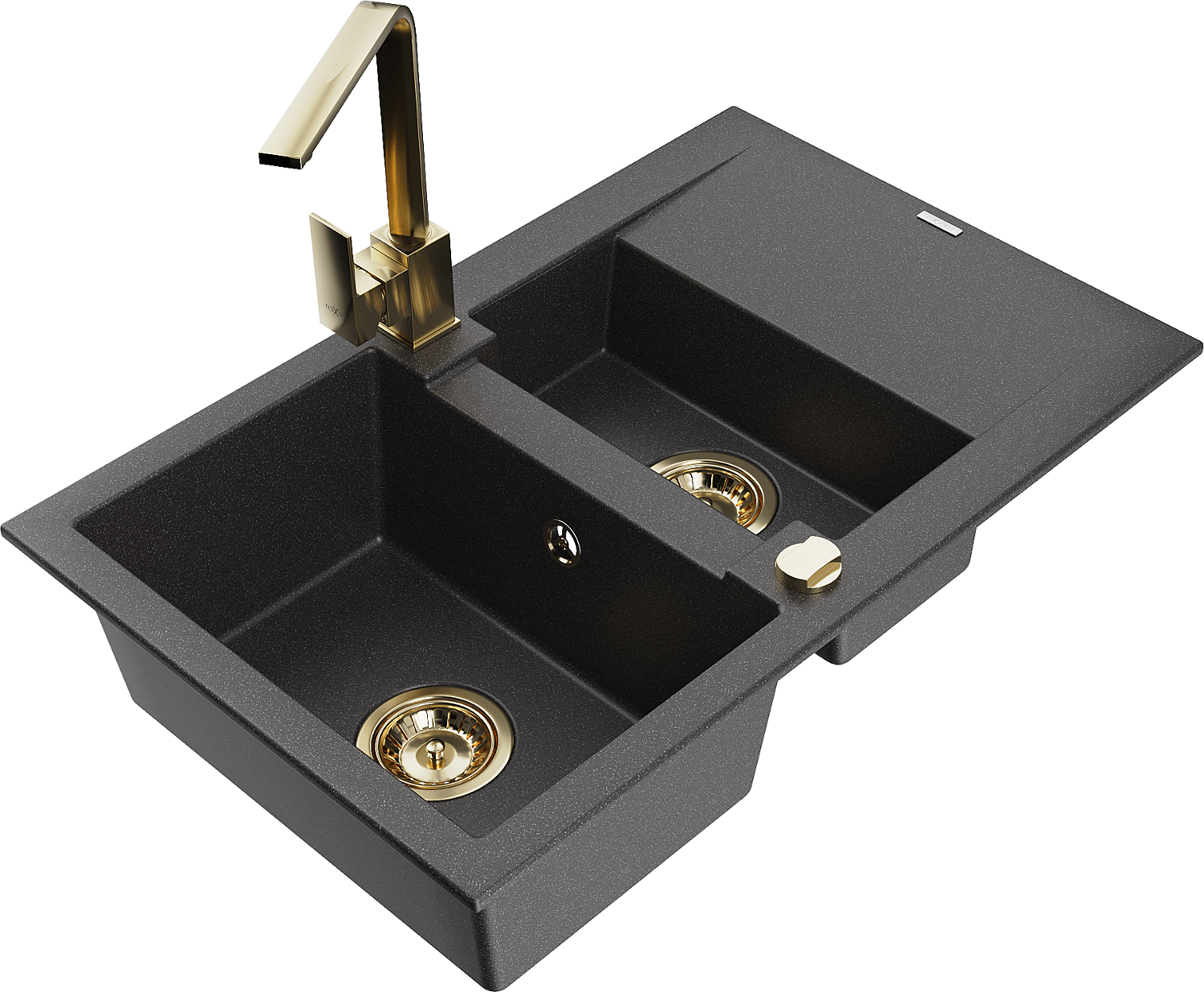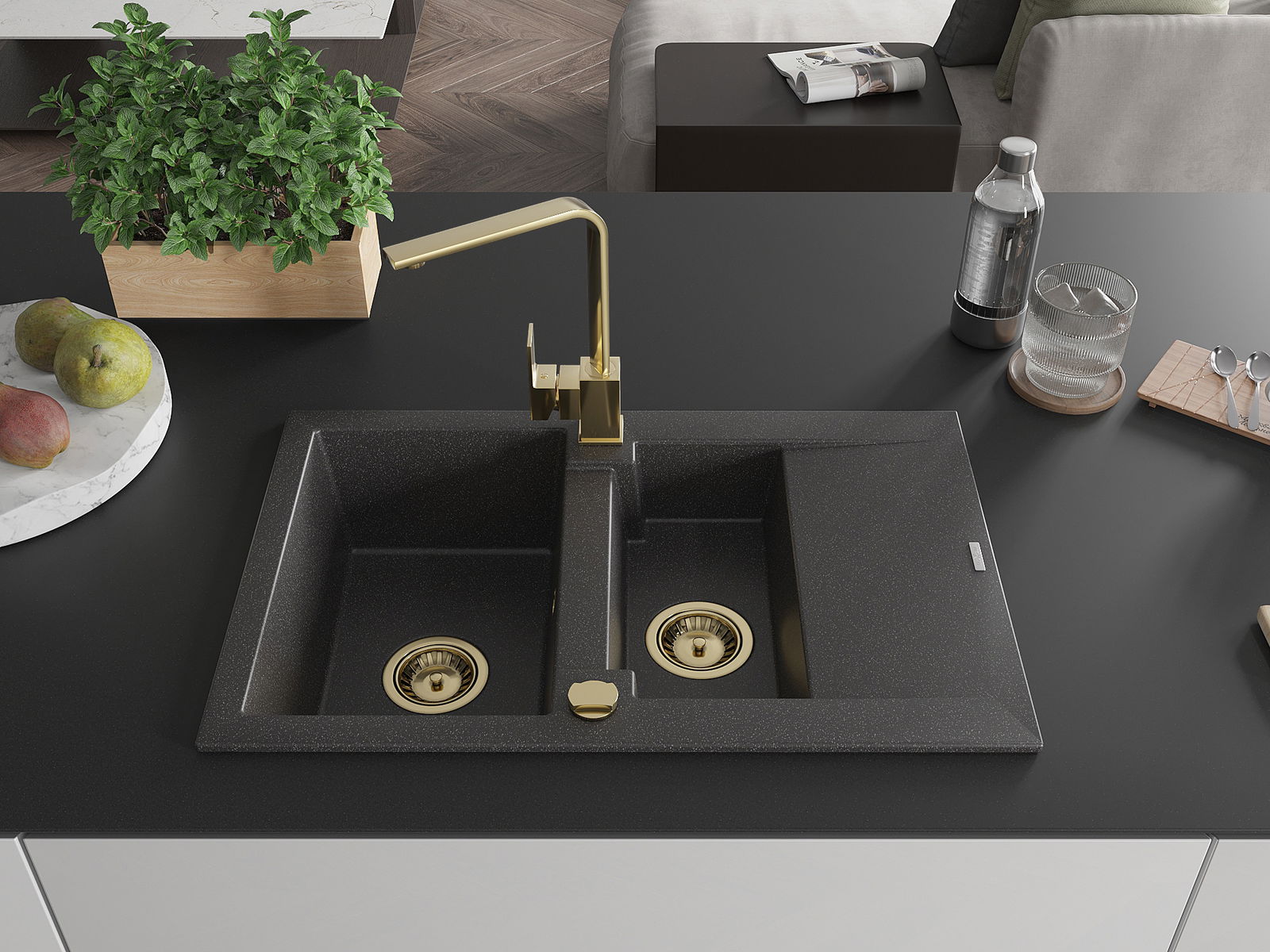 Mexen Gaspar granito plautuvė 1,5 skylių su nusausintuvu ir virtuviniu maišytuvu Rita, juodas taškuotas - 6507-76-670300-50