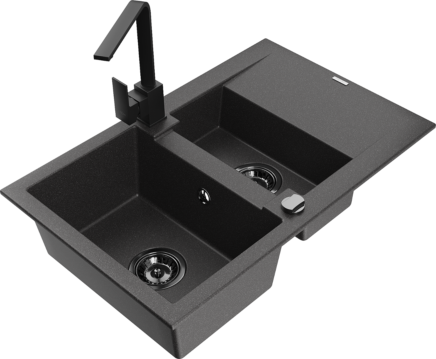 Mexen Gaspar granitinė 1,5 skyrių plautuvė su nuvarvėjimu ir virtuvės maišytuvu Rita, juodas dėmėtas - 6507-76-670300-70-B