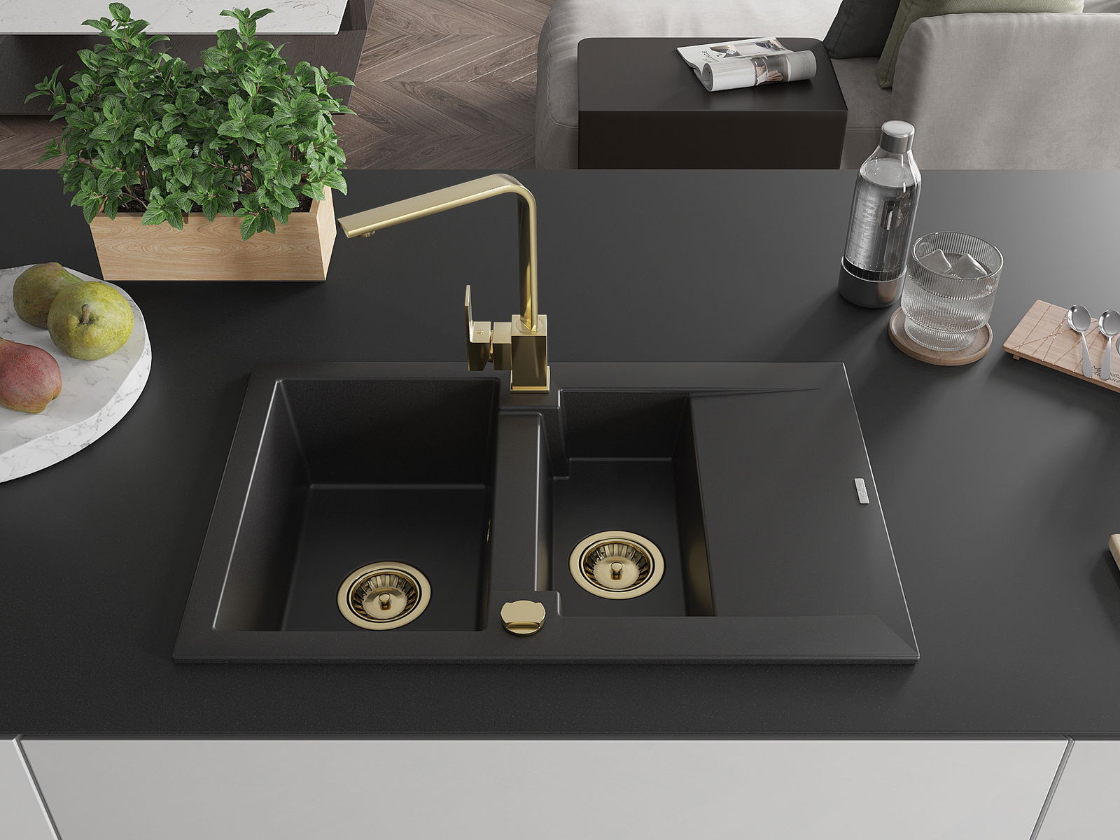 Mexen Gaspar granito plautuvė 1,5 skyriaus su nutekamuoju paviršiumi ir virtuvės maišytuvu Rita, juodas - 6507-77-670300-50