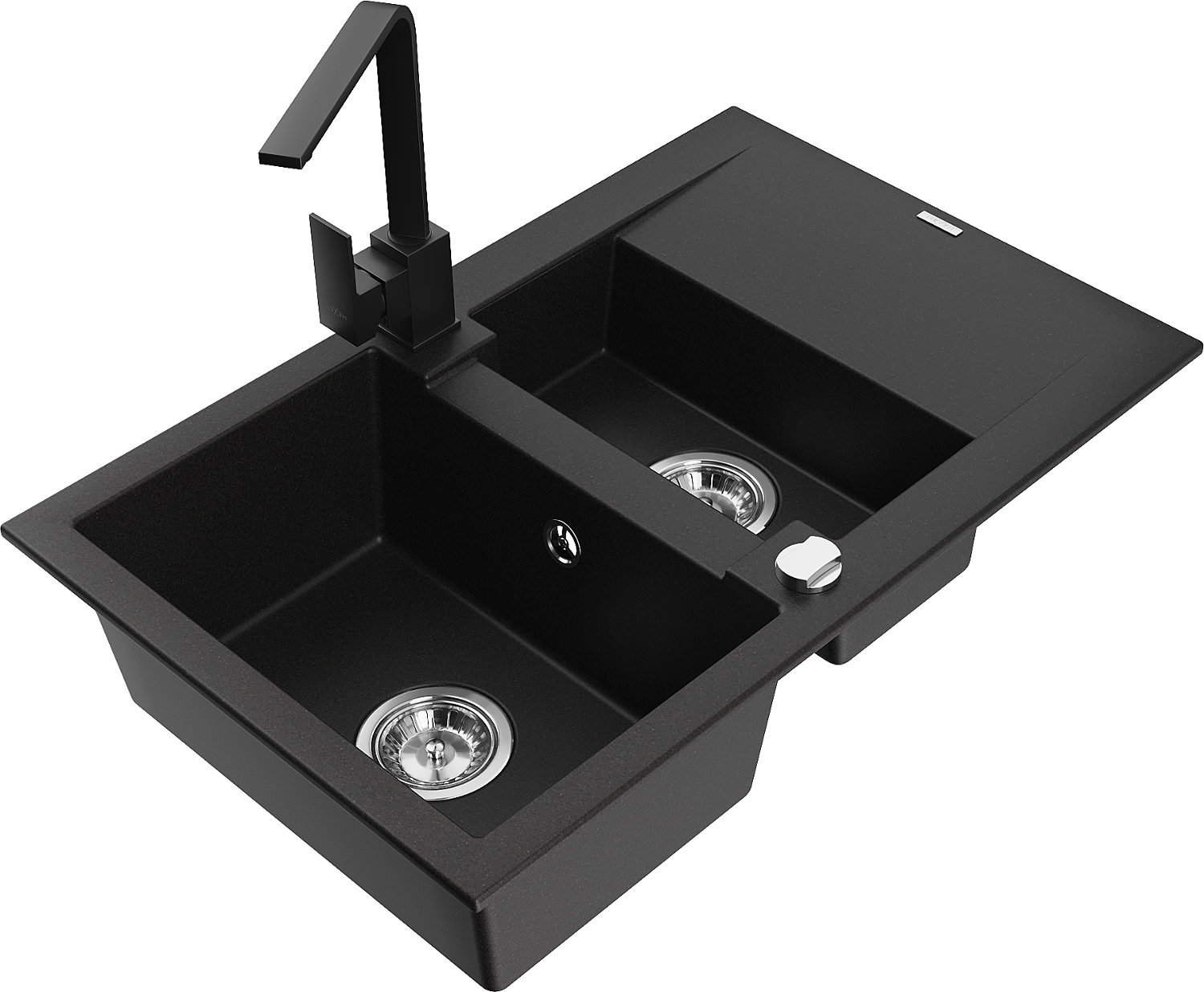 Mexen Gaspar granitinis kriauklė 1,5 skylių su nutekamuoju padėklu ir virtuvės maišytuvu Rita, juoda - 6507-77-670300-70