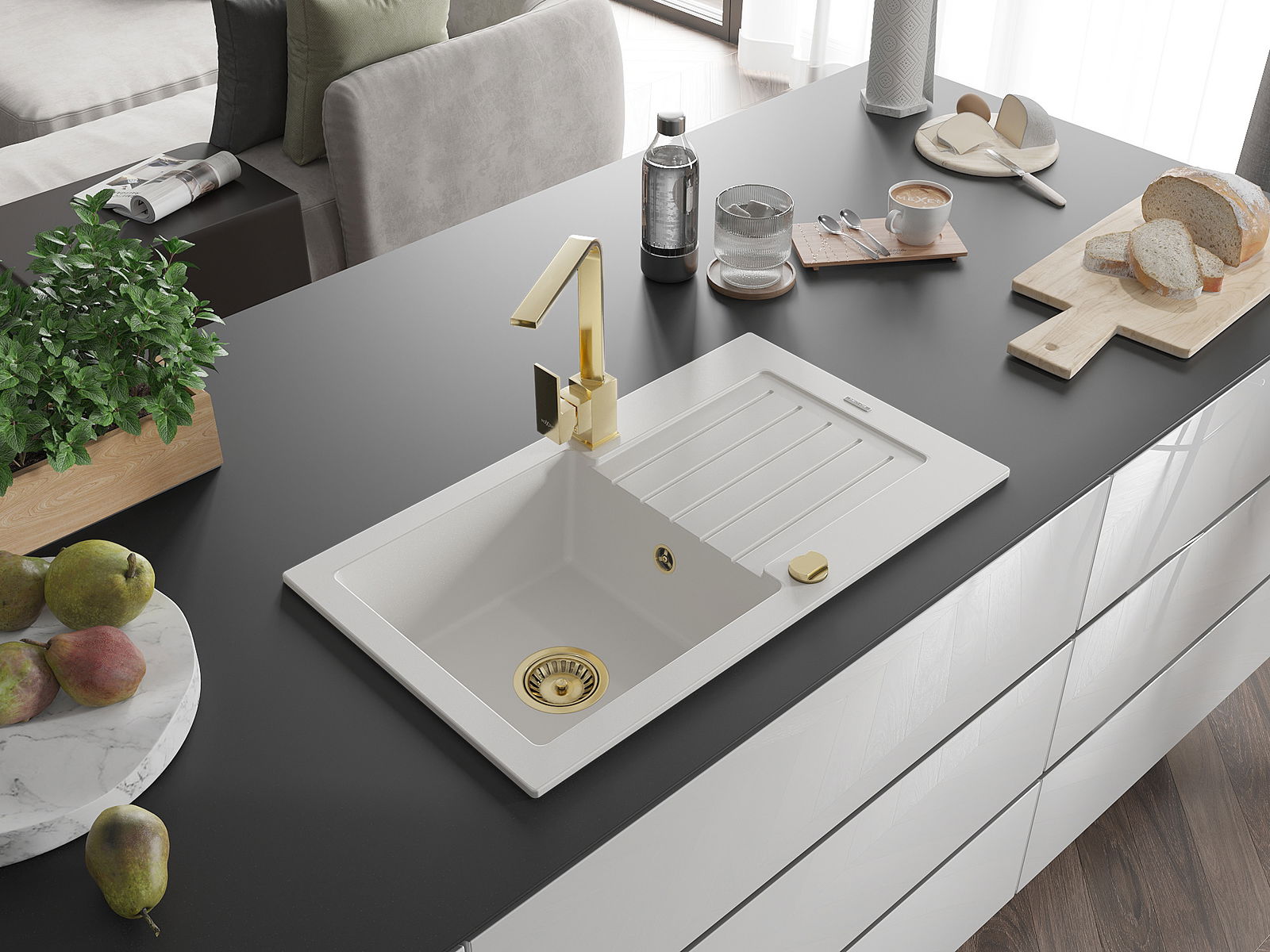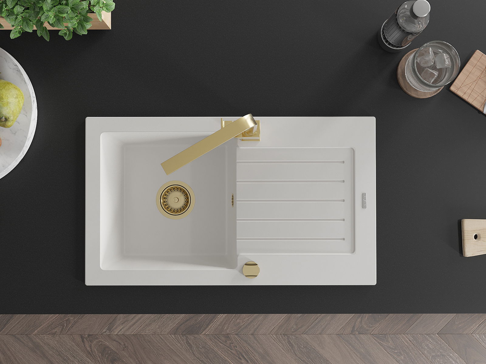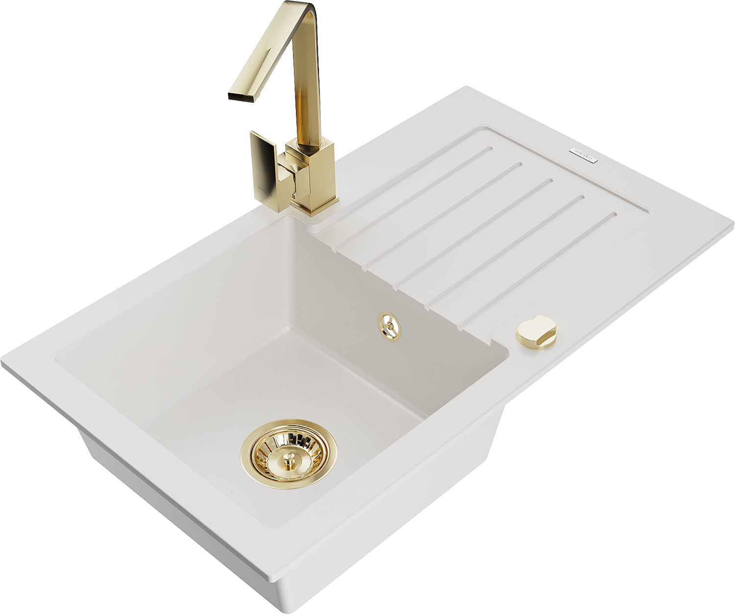 Mexen Pablo vienos kameros granito kriauklė su nutekėjimu ir virtuviniu maišytuvu Rita, balta - 6510-20-670300-50