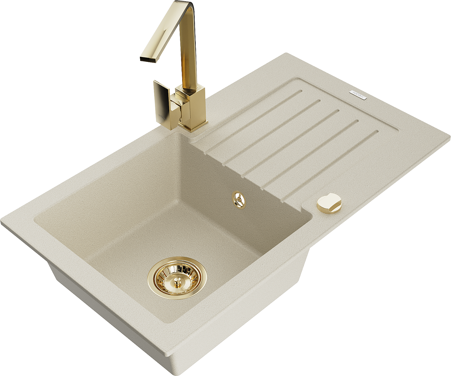 Mexen Pablo granitinė vienos kameros kriauklė su nutekėjimo lataku ir virtuviniu maišytuvu Rita, smėlio spalvos