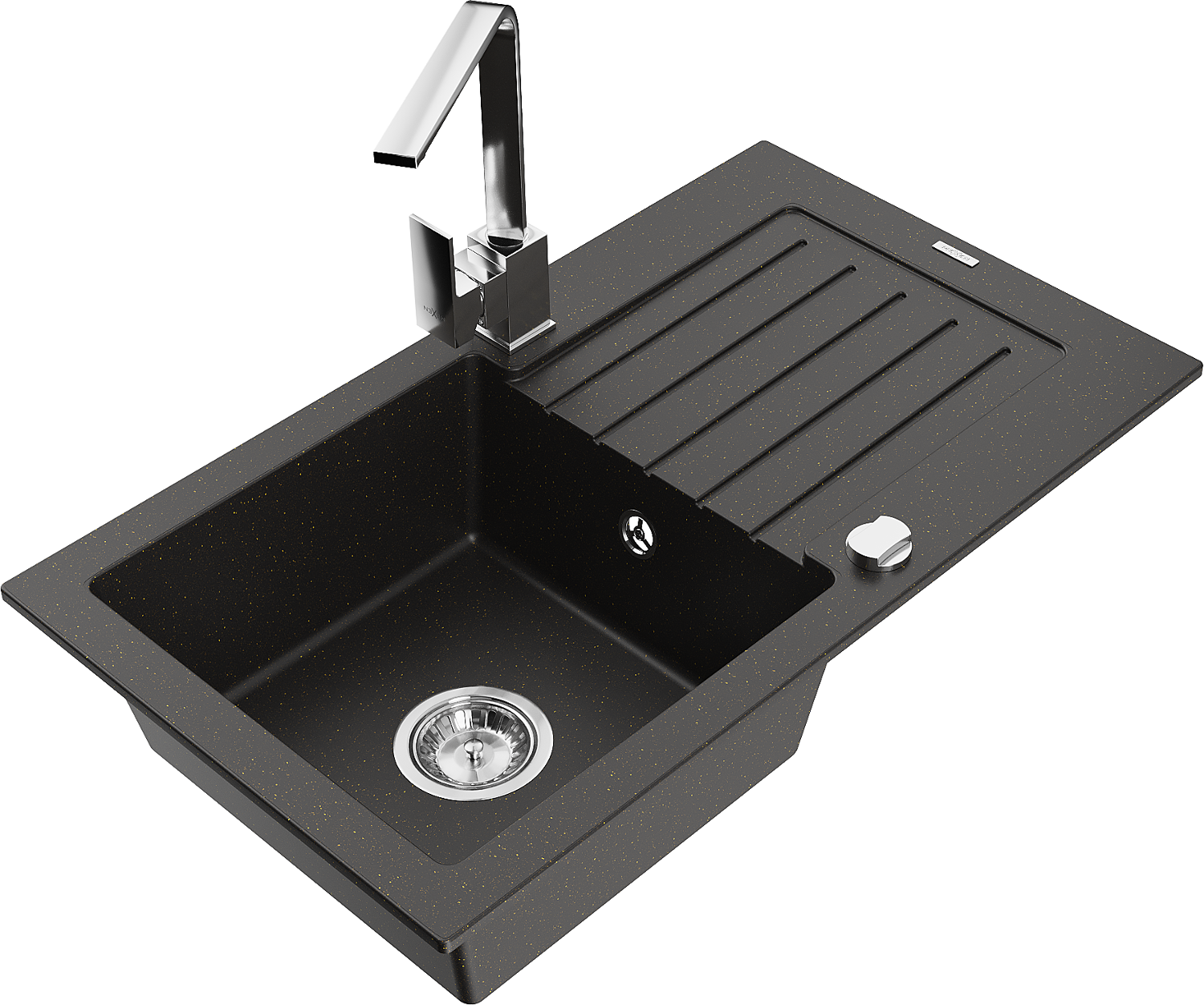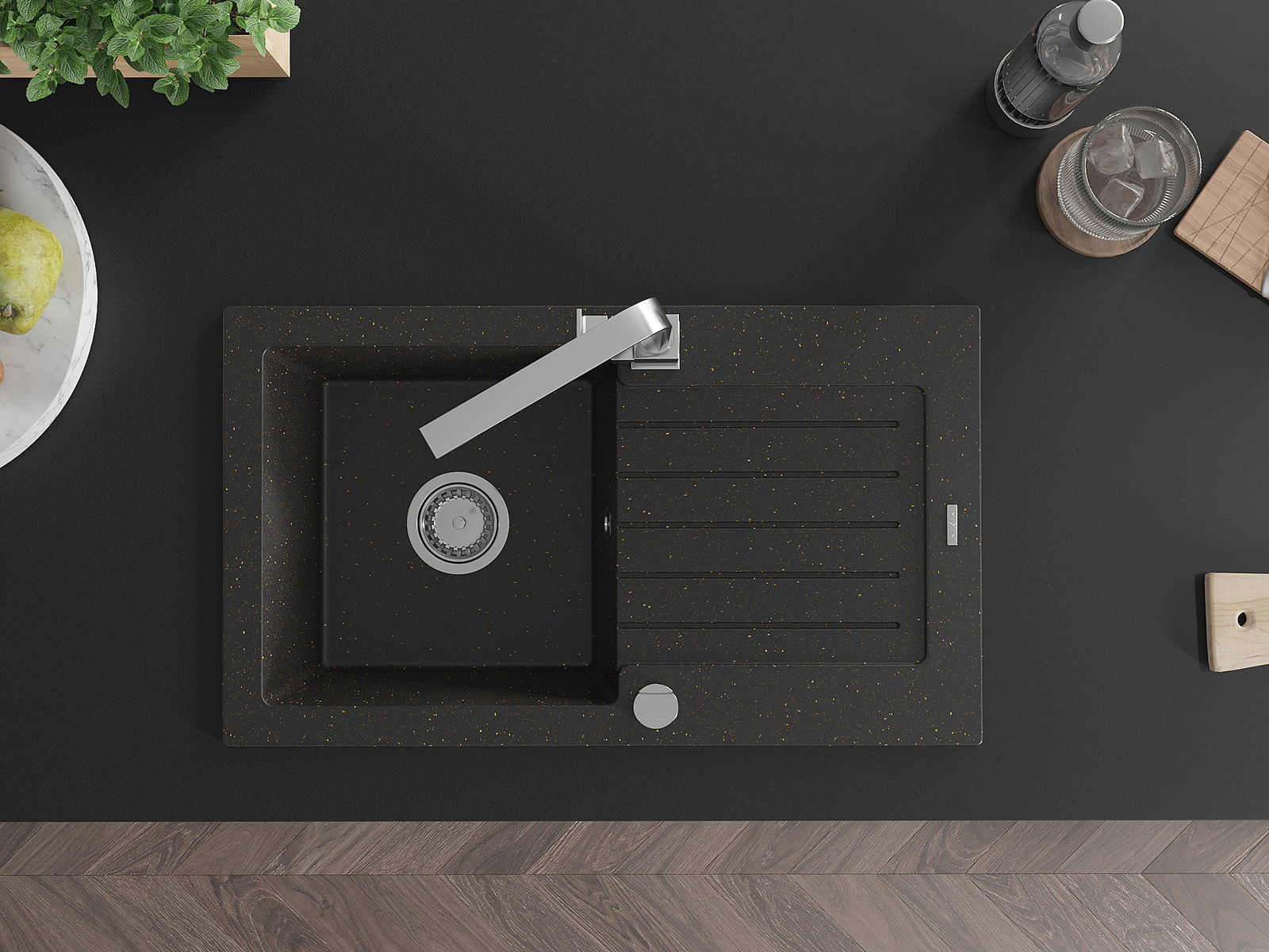 Mexen Pablo granitinė vienos kameros kriauklė su nusausinimo vieta ir virtuviniu čiaupu Rita, juoda/auksinė metaliko spalva