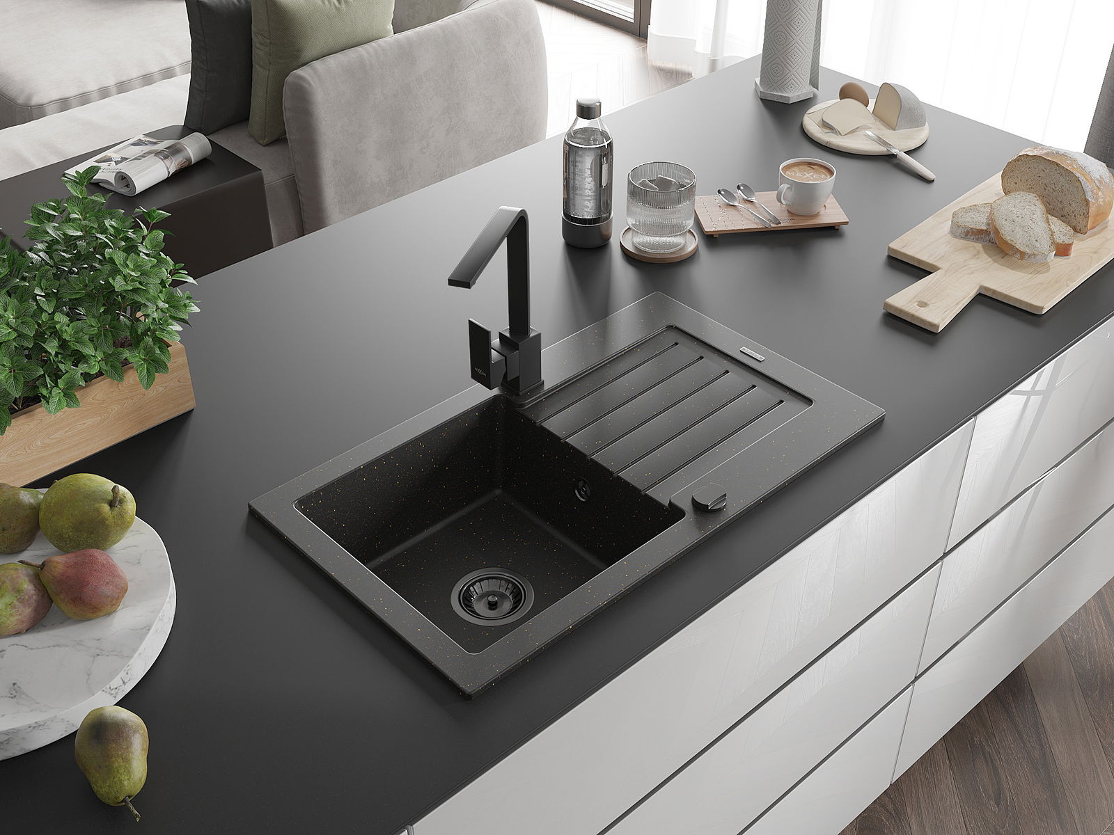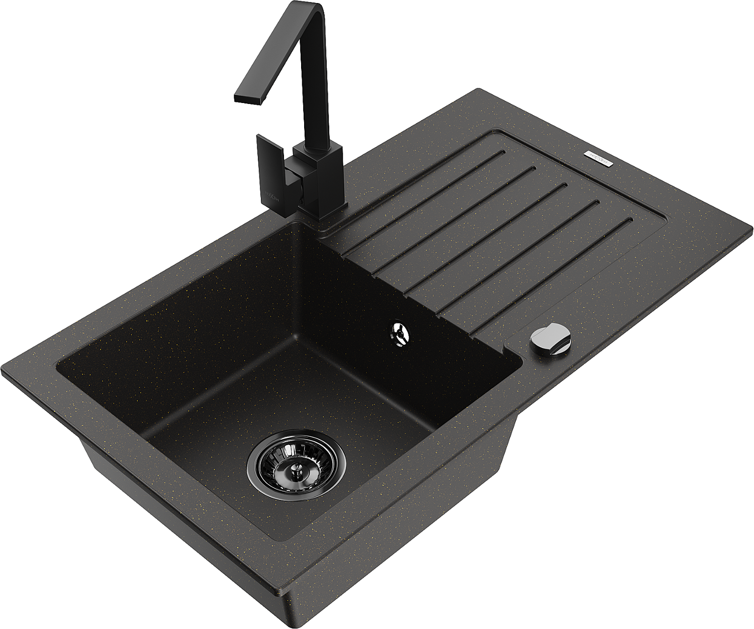 Mexen Pablo granitinė vienos kameros plautuvė su drenažu ir virtuviniu maišytuvu Rita, juoda/auksinis metalikas
